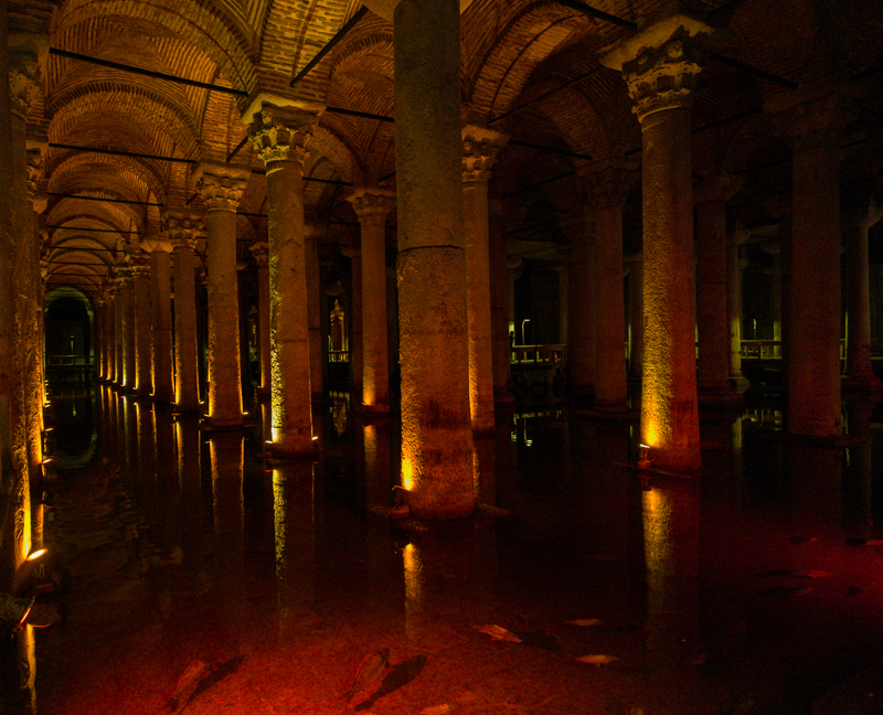 Wir beginnen mit zwei Stationen Straßenbahn (immerhin doch ein guter Anfang) zur Hagia Sophia. Unser Ziel ist aber die direkt nebenan liegende Cisterna Basilica, ein von 336 je 8 Meter hohen Säulen getragenes Gewölbe. Mit einem Fassungsvermögen von 80.000 Kubikmeter sollte die im 5. Jahrhundert gebaute Anlage die Wasserversorgung der Hagis Sophia sicherstellen. Ich wollte gern dorthin, weil eine Szene im James Bond Film „Liebesgrüße aus Moskau“ dort spielt, eine wirklich beeindruckende Anlage!