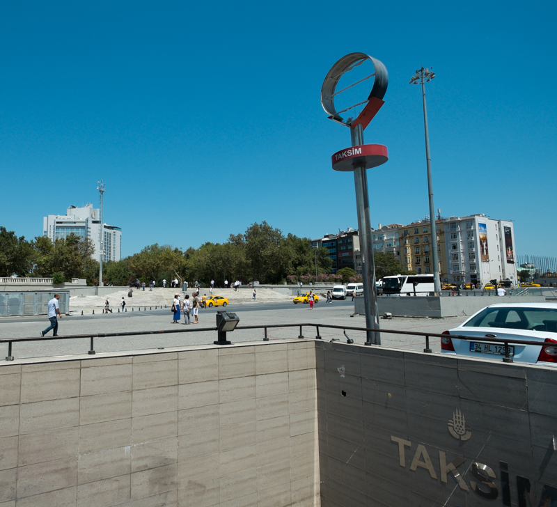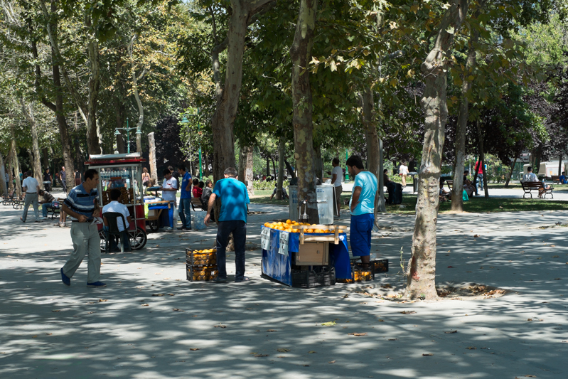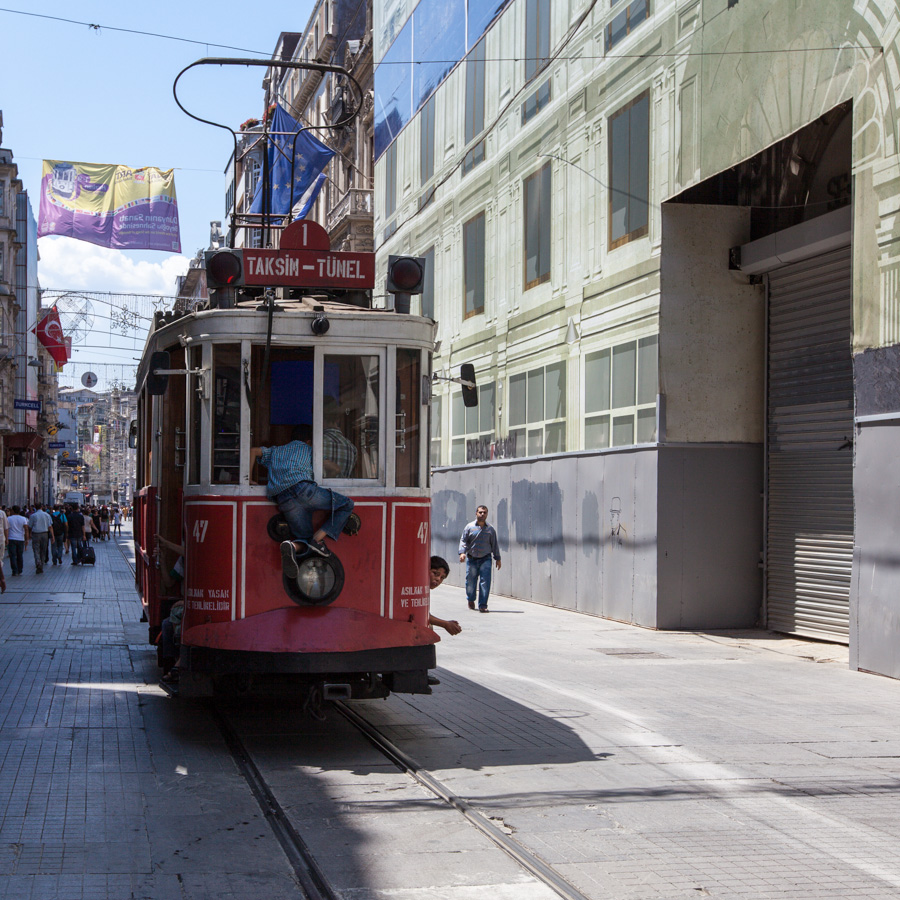 Weiter geht es mit der Straßenbahn auf die andere Seite des goldenen Horns nach Karaköy. Von dort gibt es eine historische Standseilbahn hinauf nach Tünel. Der Tunnel ist historisch, die Bahn doch recht modern und sie bringt uns in minutenschnelle den Berg hinauf. Hier beginnt die Istiklal Caddesi, eine der Haupteinkaufsstraßen Istanbuls, sie führt von Tünel zum Taksim Platz (Ihr merkt schon wo wir hinwollen). Es ist eine ganz normale Einkaufsstraße, wie die Breite Straße in Lübeck, die Mönkebergstraße in Hamburg usw. Besonders ist hier nur, dass eine historische Straßenbahn – und die ist nun wirklich historisch – durch die Straße zuckelt und in den Gassen links und rechts das ein oder andere Freitagsgebet statt findet. Da wir die Abfahrt der Straßenbahn gerade verpasst haben, laufen wir die Straßen hinauf bis zum Taksim Platz. Ein paar versprengte Polizisten stehen am Rande des Platzes, aber sonst ist von den Unruhen der letzten Wochen nichts mehr zu sehen und so schlendern wir weiter in den Gezi Park, der – im Gegensatz zum Taksim Platz – wirklich sehr schön ist. Hier ruhen wir uns im Schatten der Platanen bei einem frisch gepressten Orangensaft aus, bevor wir den Rückweg antreten.