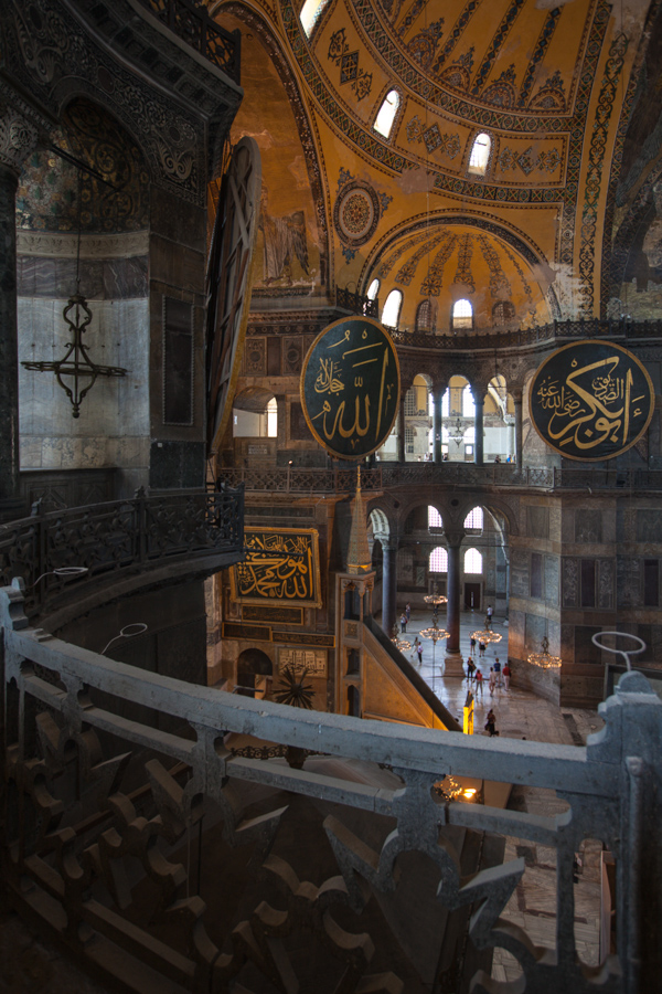 Da wir nun schon einmal hier sind, wollen wir natürlich auch die Hagia Sophia von innen anschauen und da heißt es erst einmal am Kassenhäuschen anstehen. Während wir in der Warteschlange stehen, werden uns von „freien Reiseführern“ die verlockendsten Angebote gemacht, denen wir „nur mühsam widerstehen können. Die Hagia Sophia von innen entpuppt sich jedoch als „Großbaustelle“, bevölkert von Reisegruppen. Fotografisch ist es schwierig, das Monumentale dieser riesigen ehemaligen Moschee (heute Museum) zu erfassen.