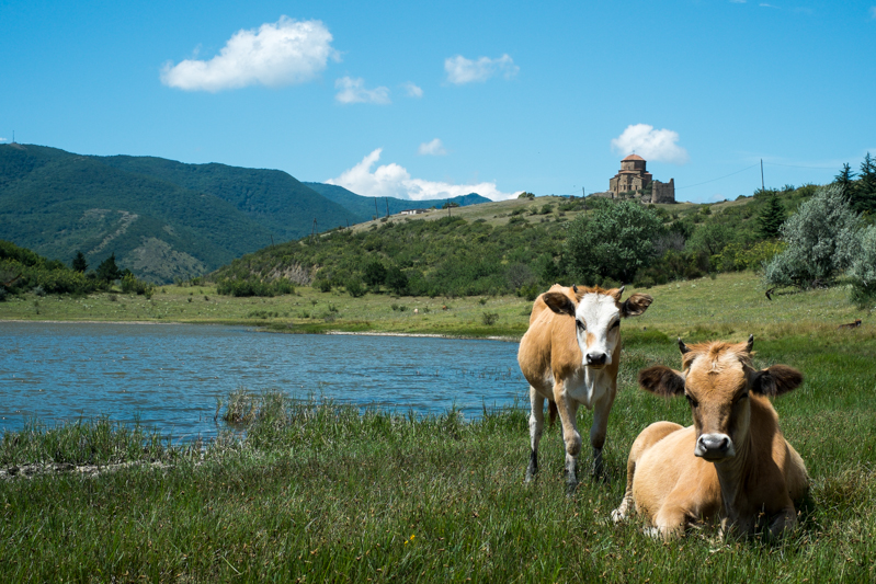 Weiter ging es zur Djvari Kirche auf den Berg hinauf. Von hier aus hat man einen herrlichen Blick auf Mzcheta. Vorher steigen wir aber aus und gehen zu Fuß um einen kleinen See herum. Hier habe ich im letzten Jahr wild lebende Schildkröten gesehen. In diesem Jahr sehen wir aber nur Kühe. Dreimal allerdings huscht eine Schlange über den Weg und jagt uns einen gehörigen Schrecken ein.