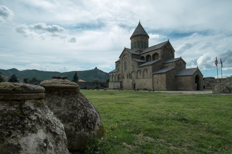 Unser erster Stopp ist die Swetizchoweli Kathedrale aus dem 11. Jahrhundert in Mzcheta. In der Kirche wird streng auf die Einhaltung der Regeln geachtet, Frauen nur im Kleid/Rock (kann man da ausleihen) und leider keine Fotos. Aber auch von außen ist die Kathedrale ein beeindruckendes Bauwerk.
