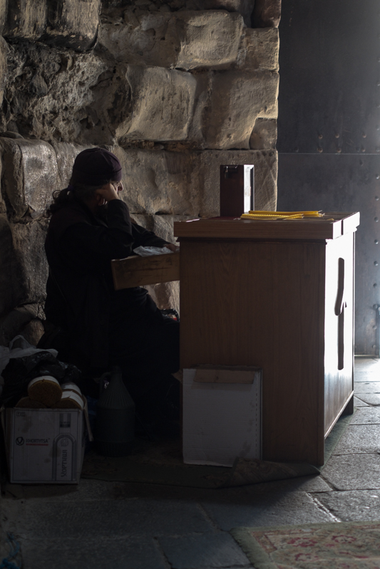 Sicheren Fußes erreichen wir dann aber doch die Kirche, wo Suliko bereits auf uns wartet. Aber für den Besuch der Kirche ist noch Zeit und hier haben wir auch die Gelegenheit einige Fotos zu machen (der „wachhabende“ Pfarrer schläft gerade).