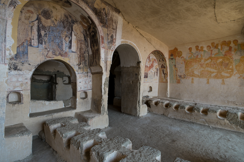 Nach einigen Minuten Fußweg sind wir plötzlich mittendrin in den Unterkünften der Mönche. In den Standstein gehauene Schlafräume, Wirtschaftsräume, Kapellen und natürlich eine Kirche und ein gemeinsamer Essraum. Alles verziert mit wundervollen Fresken aus verschiedenen Jahrhunderten. Dazu gibt es ein ausgeklügeltes System um Frischwasser zu speichern. Wieder erzählt uns George auf lebendige Weise, was die Bildnisse darstellen und wieder dürfen wir eintauchen in eine Welt die so lange Zeit zurück liegt.