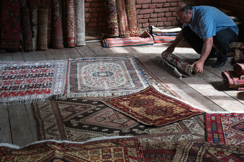 Unser heutiger Tag beginnt direkt neben unserem Hotel Old Signaghi. Hier werden Teppiche nach original georgischen Mustern und Techniken in Handarbeit mit Naturfarben hergestellt. 18 Frauen knüpfen und weben hier Teppiche, teils in Heimarbeit. Der Besitzer zeigt uns stolz die Ergebnisse. Mehrere Jahre hat er in Georgien und den umliegenden Ländern geforscht, um die speziellen georgischen Techniken zur Färbung und Herstellung von Teppichen wieder zu beleben. Besonders die geknüpften Seidenteppiche haben es mir angetan und auch hier gibt es zu jedem Teppich eine Geschichte.