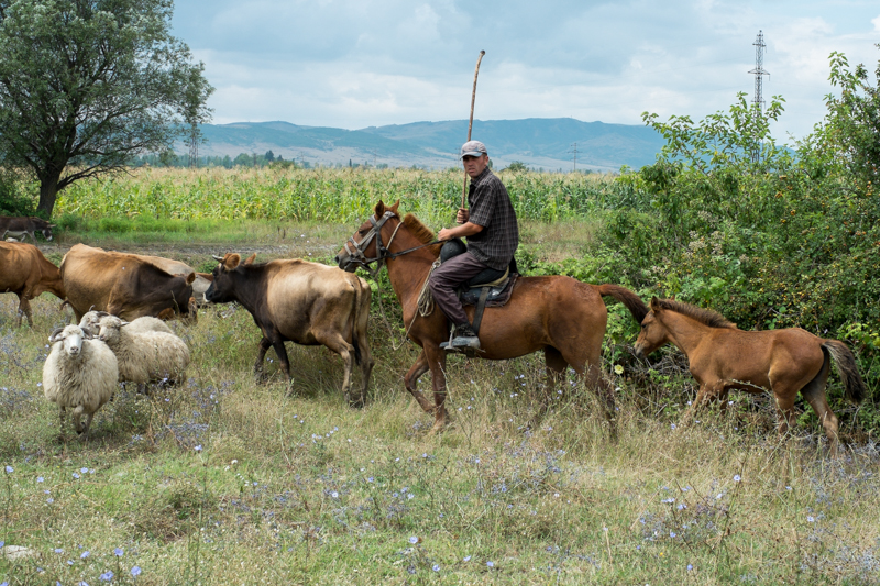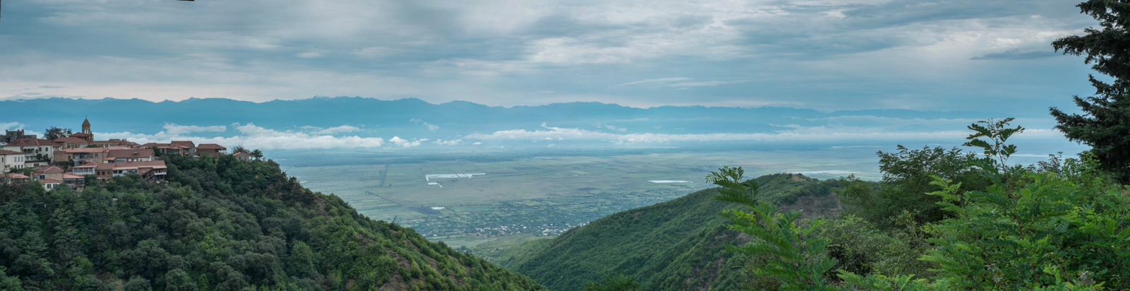 Dafür haben wir eine herrlich Aussicht über die Alazani-Ebene, der Bilck auf den großen Kaukasus ist frei, nur einige Wolken ziehen durch das Tal.