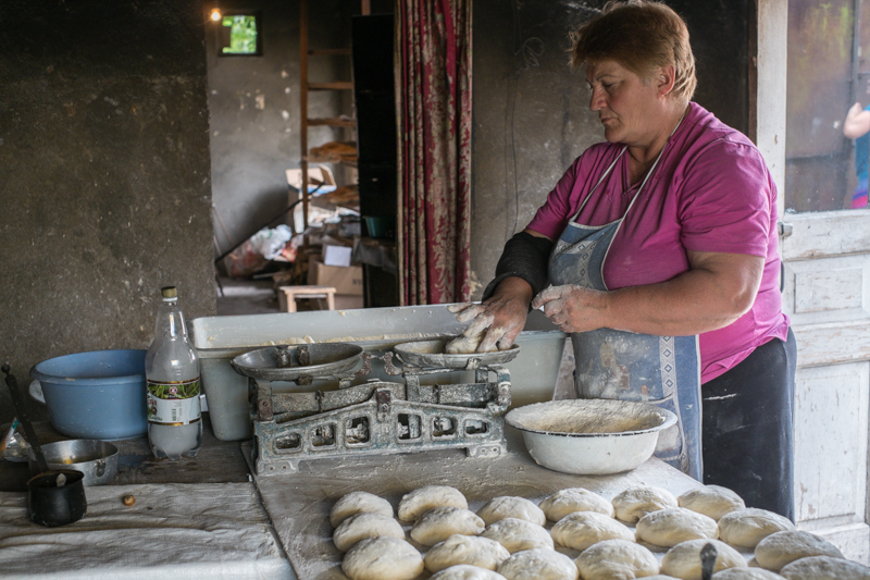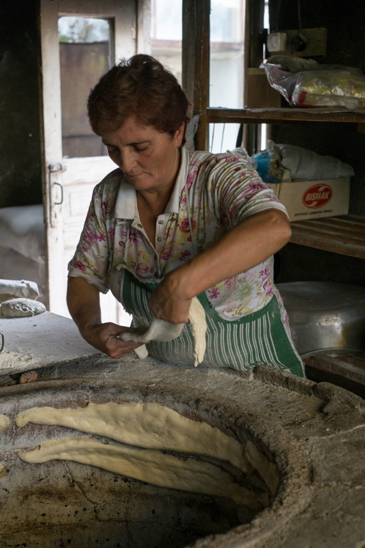 Nun machen wir uns aber auf den Weg zu unserem heutigen Tagesziel, dem Kloster David Gareja. Wir verlassen die hügelige Landschaft und legen dann doch einen spontanen Stopp an eine Bäckerei ein. Schließlich wollen wir ja einmal anschauen wie das leckere Brot gebacken wird. Die beiden Bäckerinnen sind zwar erst etwas verwundert über den merkwürdigen Besuch, aber George hält die beiden Damen durch Plaudereien geschickt bei Laune und so können wir ungestört dem Treiben zuschauen und unserer Fotos machen. 30 Brote werden in einem Backdurchgang hergestellt. Der Ofen wird mit Holz beheizt und die Frauen „kleben“ die Brote mit den Händen ohne irgendwelchen Schutz in den 200 Grad heißen Ofen. Die fertigen Brote werden dann mit einer Art Haken wieder herausgeangelt, wenn Sie sich von der Wand lösen lassen.