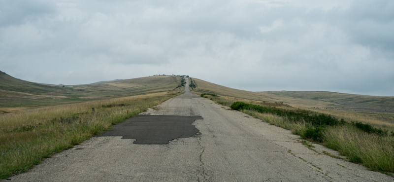 Wir können uns gar nicht vorstellen, dass hier überhaupt noch irgendetwas kommt. Aber wir sehen plötzlich inmitten dieser Einöde die Ortschaft Udabno. Sie wurde in kommunistischer Zeit komplett neu hier aufgebaut um Georgier die in den Bergen durch Schneelawinen obdachlos geworden waren aufzunehmen. Heute ist das Dorf fast verlassen.