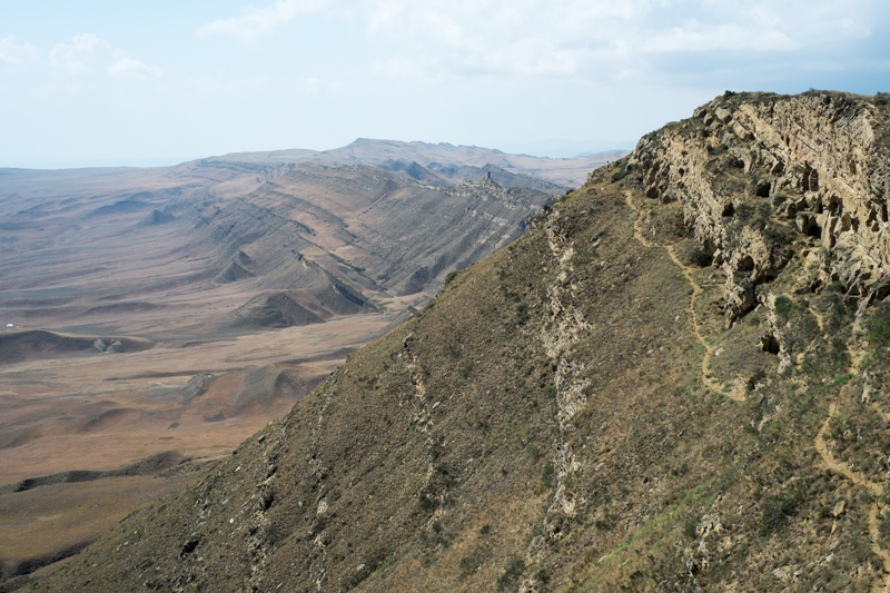 Von den in den Sandstein gebauten Unterkünften der Mönche sieht man auf den ersten Blick nicht viel. Wir packen Wasser, Brot und ein paar Pfirsiche ein und machen uns auf eine Wanderung. Zunächst geht es steil bergauf und immer wieder müssen wir anhalten, nicht nur um nach Luft zu japsen, sondern auch um die grandiose Aussicht zu genießen. Auf dem Kamm oben angekommen blicken wir Richtung Aserbeidschan. Genauer gesagt läuft die Grenze hier oben auf dem Kamm und da wir etwas unterhalb des Kamms weitergehen müssen ist ein „Grenzübertritt“ erforderlich.
