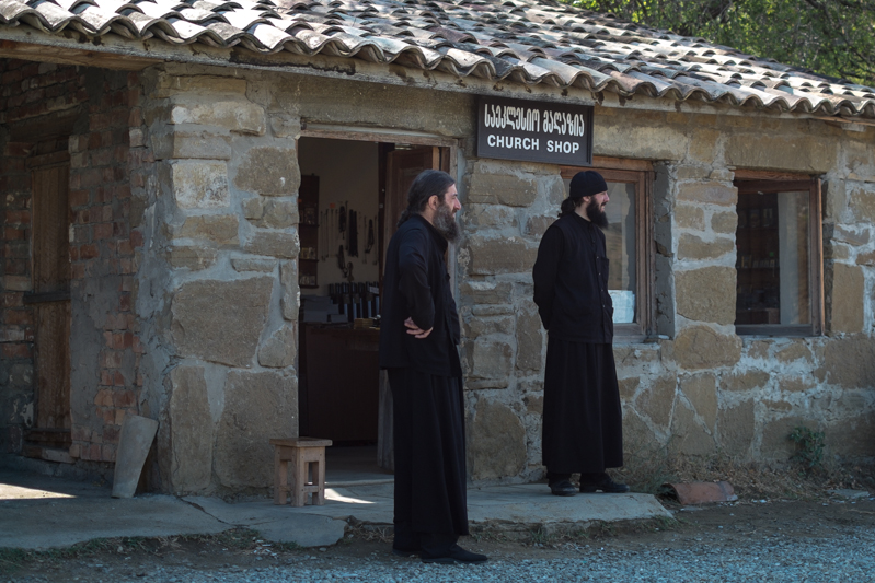 Weiter geht es durch die endlose Weite und die Hügel entwickeln sich zu Bergen. Und dann sind wir plötzlich da, am Kloster David Gareja. Man merkt es daran, dass die Straße an einem Kirchenshop aufhört.