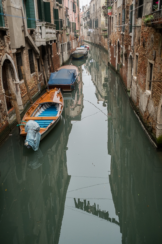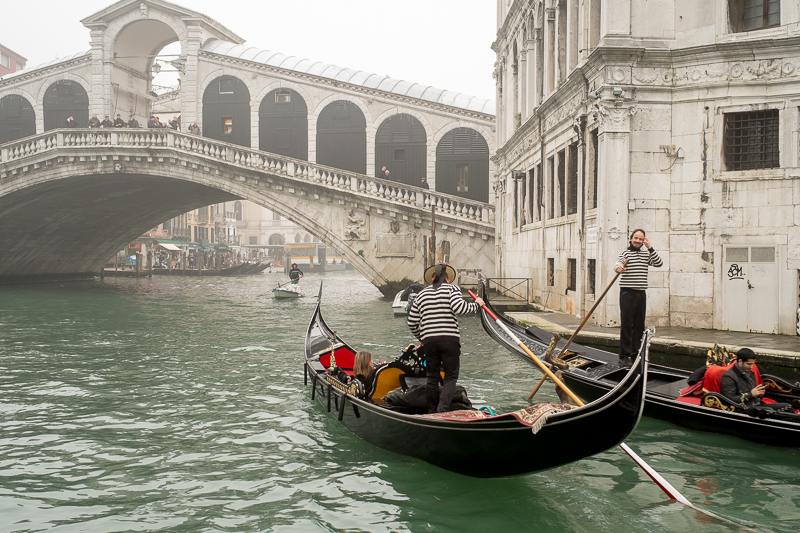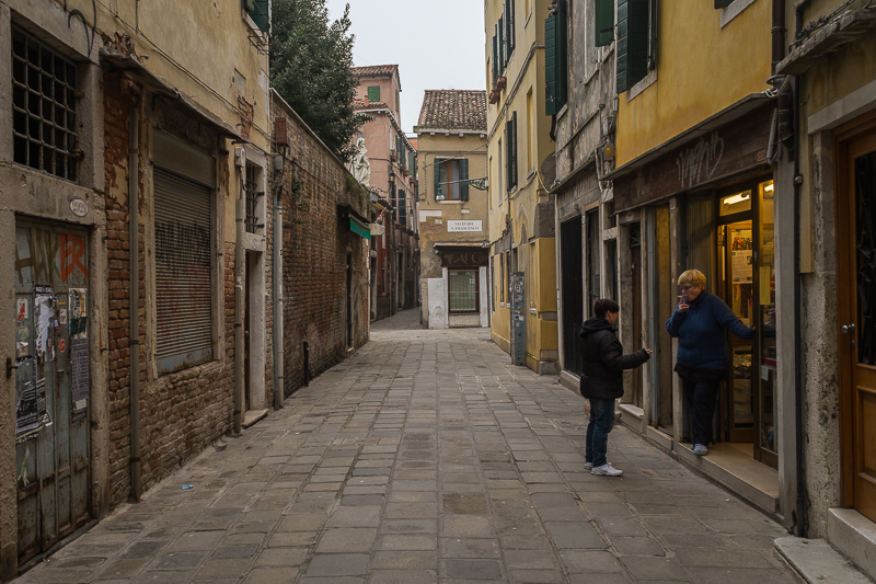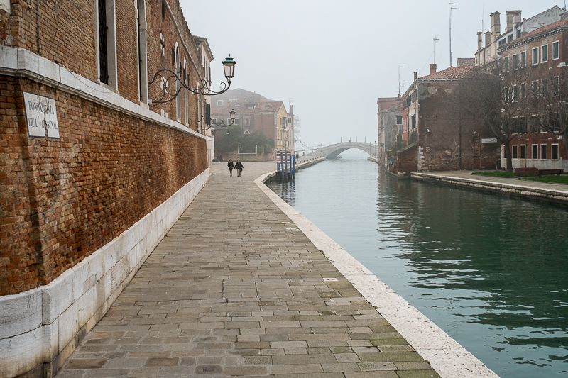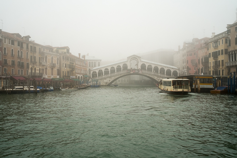 Eigentlich wollten wir heute ein wenig Streetphotographie probieren, aber Venedig präsentiert sich heute in einer ganz anderen Atmosphäre – Nebbio = Nebel und Venedig ist weg. Wir disponieren spontan um, denn den Canal Grande im Nebel zu sehen ist doch sehr verlockend. Die Vaporettos fahren nur sehr eingeschränkt, aber Linea uno, die kreuz und quer im Canal Grande fährt, ist unterwegs. Also einmal ans Nordende zum Ferrovia (Bahnhof) und dann wieder ans Südende (Wir nutzen unser Wochenkarte richtig aus). Gegen Mittag beschließen wir unsere Erforschung Venedigs mit dem den Stadtteilen rund um das Hospital fortzusetzen, also wieder zurück zur Rialtobrücke und dann schlagen wir uns in die Seitengassen. Nur wenige Meter von der Hauptstraße mit Menschenmassen, vielen Geschäften und Touristen, sind wir plötzlich fast allein unterwegs. Wir schlendern durch die alten Gassen, verfallenen Häuser, einsame Kanäle – Motive gibt es ohne Ende. Bei Einbruch der Dunkelheit erreichen wir das Arsenal auf der Südseite unweit des Markusplatzes. Vor hier geht es wieder durch die Menschenmassen, vorbei an der „japanischen Metrostation“ – die hier einfach irgendwo sein MUSS- zurück zu unserem Hotel.