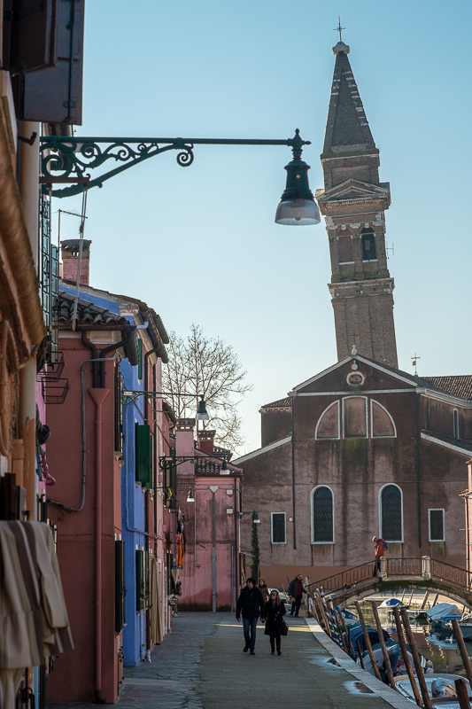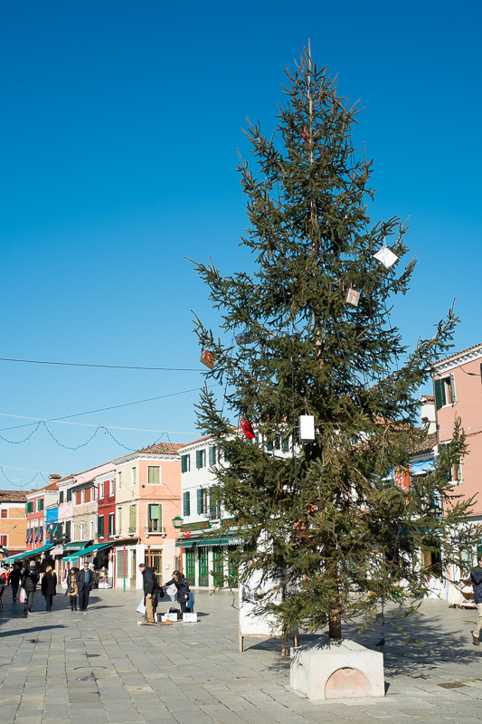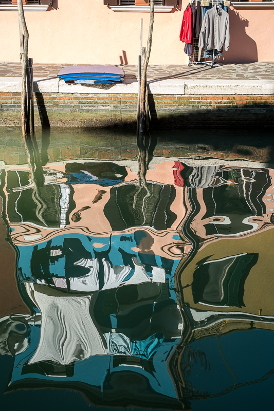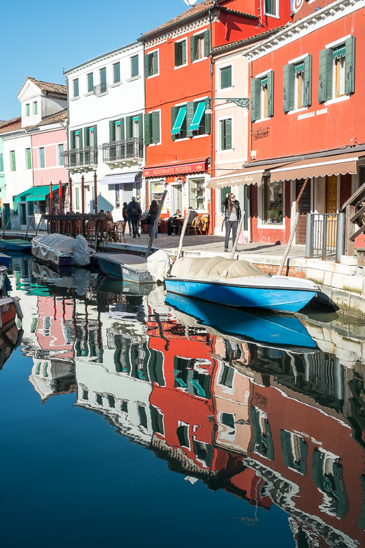 Als die Sonne etwas höher steht, zieht es uns auf die Insel Burano. Nach eineinhalb Stunden Fahrt können wir in den Kanälen die tollen Spiegelungen der bunten Häuser fotografieren. Auch wenn Weihnachten hier offenbar noch nicht vorbei ist, diese Insel ist ein echtes fotografisches Highlight. Wir lassen uns durch die Gassen treiben und entdecken immer neue Motive.