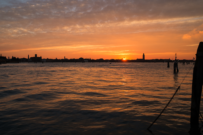Rechtzeitig zum Sonnenuntergang sind wir aber wieder auf Murano, um die Silhouette Venedigs im Abendrot zu erleben. So geht eine tolle Woche mit einem prachtvollen Sonnenuntergang zu Ende.