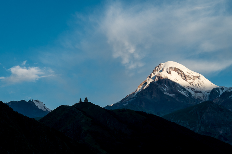 Wir haben es uns nach der Anreise mit Hindernis in unserem komfortablen Hotel in Stepanzminda gemütlich gemacht. Mein Darmvirus hält sich hartnäckig und kämpft nun offenbar mit den verordneten Medikamenten um die Vorherrschaft in meinen Körper. Und obwohl ich mich eigentlich schonen will, lockt mich der blaue Himmel dann doch um 6.30 in den Ort um „das-klassische-Kasbeg-Sonnenaufgangsfoto“ zu machen.