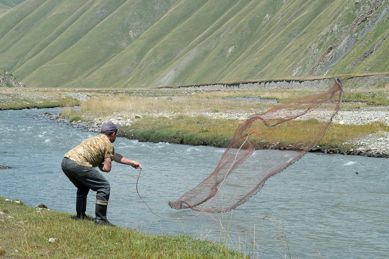 Ich stelle mich auf einen langen Nachmittag ein… bevor ich jedoch noch einmal über eine andere Kameraposition nachdenken kann, ist die Aktion schon beendet. Mir fällt die Kinnlade runter… drei, vier Würfe und das Abendessen für die Familien und Gäste ist im Sack. Das Forellen fangen geht hier, am Ende der Welt, also schneller als der Einkauf bei Nordsee in Deutschland!