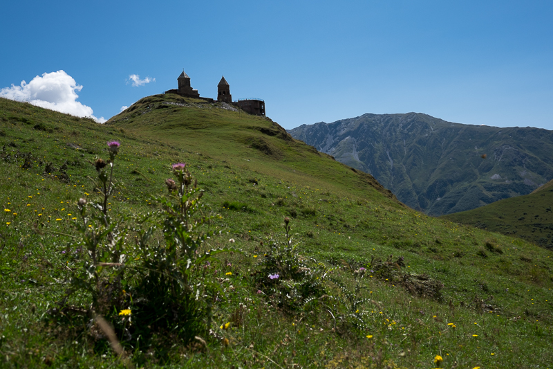 Für den Aufstieg zu dieser Kirche, der Dreifaltigkeitskirche, fühle ich mich aber doch noch zu schwach. Lasha hat natürlich eine Lösung parat und und in zwei Minuten ist ein Off-Roader organisiert. Die Fahrt hinauf (und auch hinunter) würde ich mal als „shake it Baby, shake it“ bezeichnen. Als wir nach eine halben Stunde auf abenteuerlichen Pfaden (Straße wäre wirklich übertrieben) oben ankamen, waren wir doch erstaunt, das noch alle am selben Platz saßen. Gefühlt haben wir jeder jede Ecke des Fahrzeugs kennen gelernt.