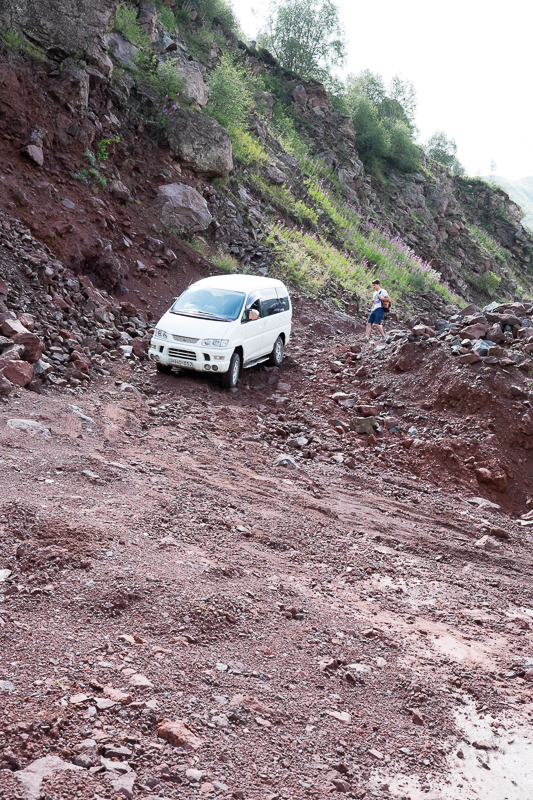 Das Trussotal liegt im Grenzbereich zu Russland und Südossetien. An der „üblichen“ Einfahrt ins Tal ist eine Brücke über den Fluss, die wie Lasha es ausdrückte, „heruntergefallen“ ist. Um also mit dem Fahrzeug in das Tal zu gelangen müssen wir über den Pass. Was unser Fahrer bei der Fahrt über diesen Pass an Fahrkünsten aufbot war einfach unbeschreiblich. Dagegen war unserer gestrige „Shake it Tour“ zur Kirche ein entspannter Familienausflug auf einer gut ausgebauten Straße, denn meist bewegten wir uns auf Steinbruch ähnlichem Gelände.
