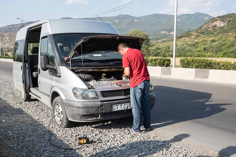 Kurz vor Tbilisi gab es dann ein merkwürdiges Geräusch, rechts ran und der rechte Vorderreifen war platt. So ein Mist, aber Dato ärgerte sich offenbar mehr, dass er nun nicht rechtzeitig zum Abendessen zu Hause sein würde. Ruckzuck war eine elektrische Pumpe ausgepackt, angeschlossen und der Reifen wieder mit Druck versorgt.