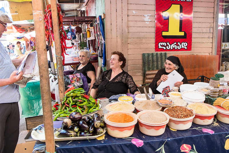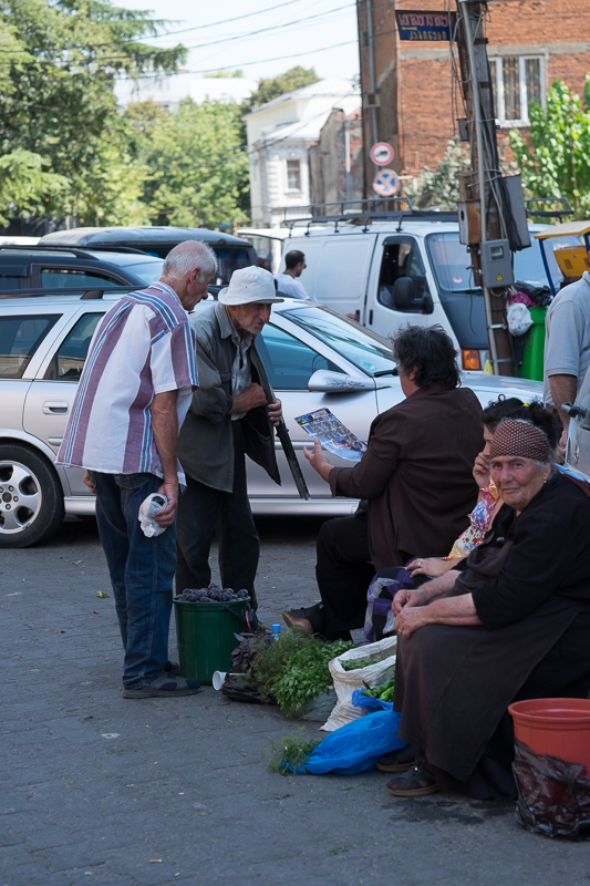 Der Nachmittag gehört Kutaisi. Wir stärken uns im Stadtpark mit einem Getränk und dann geht es auf den Markt – Bilder verteilen. Hier ist es wieder ein großes „Hallo“ und nun wollen natürlich alle fotografiert werden. Vor dem Markt treffen wir auf Shota, den ich ebenfalls im April fotografiert habe. Nino findet heraus, dass er Fotojournalist war und er kramt natürlich auch sofort einen alten Zeitungsartikel hervor. Nun werden noch Fotos an die Mehlhändler verteilt und damit haben wir alles erledigt. Es bleibt noch genug Zeit für einige Fotos auf dem Markt und in der Stadt.