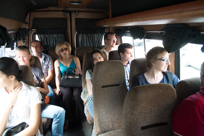 Das Prinzip ist gar nicht so kompliziert. Man stellt sich an die Straße und wartet bis die passende Marschutka vorbei kommt, dann hält man die Hand raus, die Marschutka stoppt und man steigt ein. Einziges Problem, man muss einfach wissen wohin das Ding fährt. Hier in Kutaisi gibt es bei einigen sogar Liniennummern. Ansonsten stehen die angestrebten Stadteile einfach auf einem Schild in der Windschutzscheibe – auf georgisch! Wir wussten aber, dass wir die Linie 100 nehmen müssen. Zum Glück war sie noch nicht so voll und wir bekamen noch Sitzplätze. Meist sind die Dinger jedoch so voll, das eine Sardinenbüchse dagegen geräumig ist. So fuhren wir quer durch die Stadt, erkannten im Vorbeifahren sogar einige Dinge wie den Stadtpark und den großen Brunnen wieder und erreichten schließlich ziemlich durchgeschüttelt das Parlament. Aussteigen ist genauso einfach. Man geht nach vorn zur einzigen (!) Tür beziehungsweise man ruft von hinten, was den Fahrer zu einer augenblicklichen Vollbremsung veranlasst – und so ist man dann ebenfalls „vorne“. Beim Austeigen legt man dem Fahrer das Geld hin – für uns waren das 0,8 Lari pro Person.
