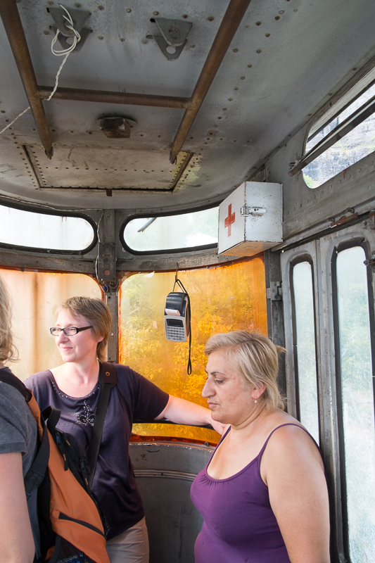Der letzte Stopp galt einer kleinen Seilbahn, dessen Kabine eher aussieht wie ein Dixie-Klo. Auch hier mussten wir natürlich mit. Oben angekommen verließ die einzige andere Passagierin die Kabine, während wir uns noch am sortieren waren. Unvorsichtigerweise hatten wir dabei offenbar die Tür wieder geschlossen und sie ließ sich von innen nicht mehr öffnen. Wir waren gefangen. Nach anfänglicher Erheiterung wurde uns dann aber doch etwas mulmig, zumal es in dieser fast fensterlosen Blechdose unangenehm heiß wurde. Um nicht bei lebendigem Leibe gekocht zu werden, rief Nino unseren unten wartenden Fahrer an, damit er die Gondel wieder nach unten holten lassen konnte. Ich sah dann aber in der Bergstation jemanden am Fenster und Nino versuchte ihm unsere missliche Lage klar zu machen. Irgendwie verstand er aber das Problem nicht. Glücklicherweise kam in diesem Moment ein junger Mann, der mit nach unten wollte, er stieg ein und schon waren wir wieder auf dem Weg nach unten. Wir konnten unsere Rettungsaktion also abblasen und waren nach wenigen Minuten wieder unten angekommen. Diesmal gelang es uns auch problemlos die Gondel zu verlassen.