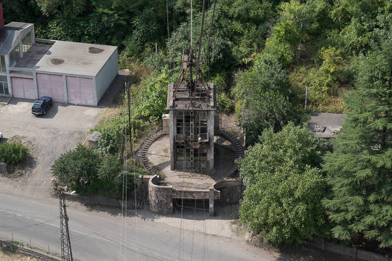 Chiatura ist die Stadt der Seilbahnen. Von ehemals rund 60 Seilbahnen sind noch 20 in Betrieb, davon 7 für den Personenverkehr und 13 für den Materialtransport. So begaben wir uns zunächst zur zentralen Seilbahn-Umsteigestation. Wir konnten einen Blick auf den Fahrstand und die technischen Anlagen werfen die seit 50 Jahren unverdrossen ihren Dienst verrichten. Wir erhielten ein kurze Sicherheitseinweisung: Vorsicht da ist Strom drin und hier ist manchmal Öl! Und dann konnte wir uns frei bewegen. Nein Daniel! Das ist kein „lost place“ – das funktioniert alles noch. Wir erfuhren, dass die Bahnen im September still gelegt und dann für 13 Millionen Euro durch neue ersetzt werden. So mussten wir natürlich noch mal mitfahren. Einmal links auf den Berg und nochmal rechts auf den Berg. Eine fantastische rustikale Technik.
