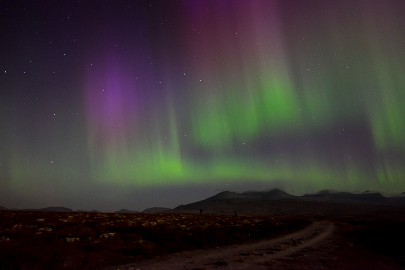 Aber das absolute Highlight der Reise haben wir nur durch Zufall erlebt. Ich endeckte nämlich zufällig in Facebook einige posts, dass es eine größere Sonneneruption gegeben hatte und nun für Donnerstag Nordlichter angekündigt waren, die sogar in Deutschland sichtbar sein sollten. Wenn schon in Deutschland, dann wohl erst recht in Norwegen und so fuhren wir um 22.00 nochmals auf die Hochebene. Ich hatte alle Teilnehmer vorgewarnt, dass die Wahrscheinlichkeit gering ist und man nie weiß wo und wann es auftritt. Wir bauten unsere Stative auf und stellten uns auf eine längere Wartezeit bei 3 bis 4 Grad ein. Das ein oder andere „Probefoto“ wurde gemacht und schon nach 10 Minuten meldete jemand „bei mir sieht es etwas grün aus!“. Tatsächlich war ein wenig Nordlicht zu sehen und während wir noch ungläubig auf das Display starrten, begann am Himmel ein unvergleichliches Schauspiel. Nordlicht bis hoch in den Zenith in grün, weiß und lila. Zwei Stunden dauerte das Schauspiel und die Speicherkarten glühten. Kurz nach Mitternacht zogen wir glücklich, durchgefroren und mit vollen Speicherkarten zurück ins Hotel.