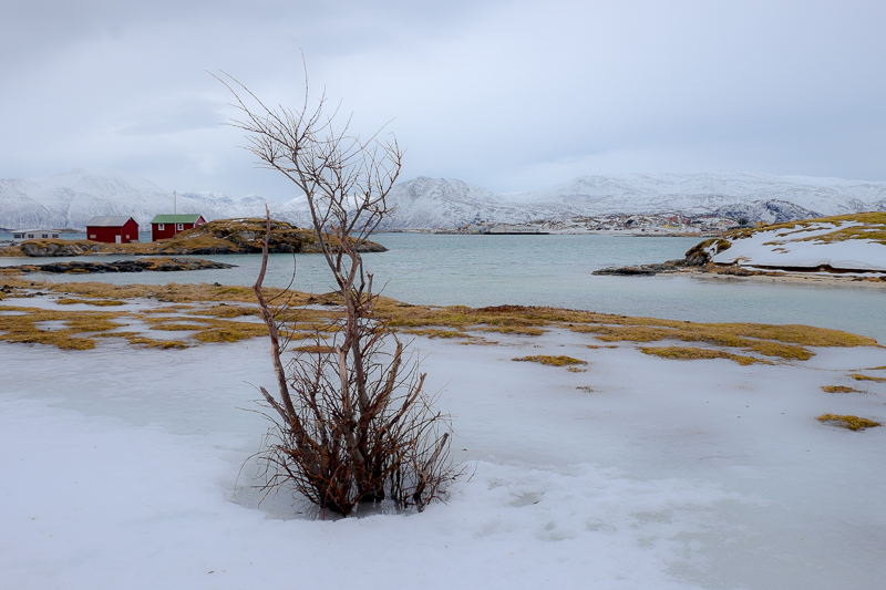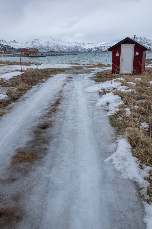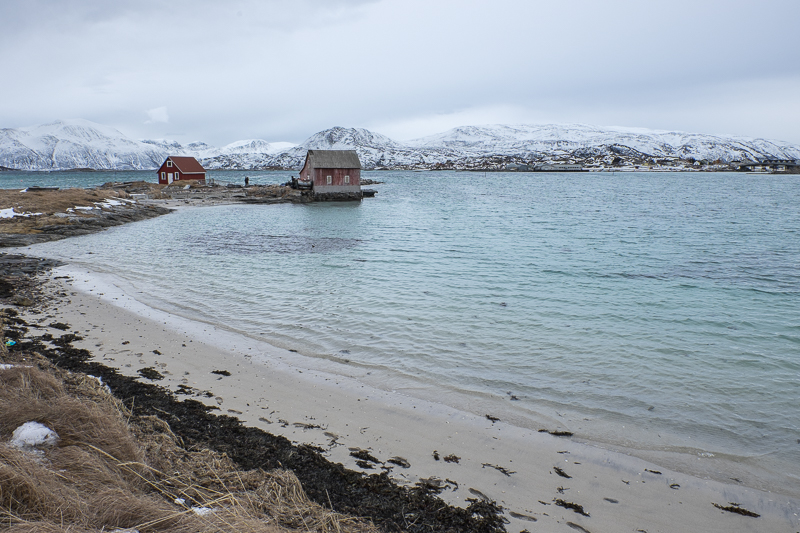Windig ist es hier am Atlantik, aber nicht wirklich kalt, wieder so um die 4 Grad plus. So bildet sich Wasser auf den Eisflächen auf den Straßen, was die Fortbewegung (sowohl zu Fuß als auch mit dem Auto) ziemlich abenteuerlich macht. Und der Ort hier – Sommarøy – ist so ganz anders als Henningsvær. Waren die Häuser dort dicht gedrängt um einen Hafen angeordnet, verteilen sich die Häuser hier weitläufig über mehrere Inseln. Es gibt Strände, Fjorde, Buchten und immer mit viel „Nichts“ dazwischen.