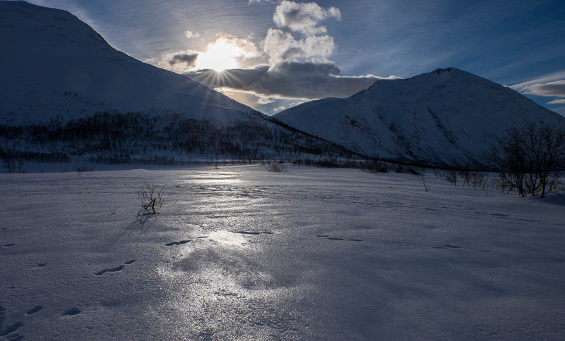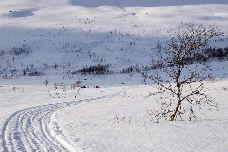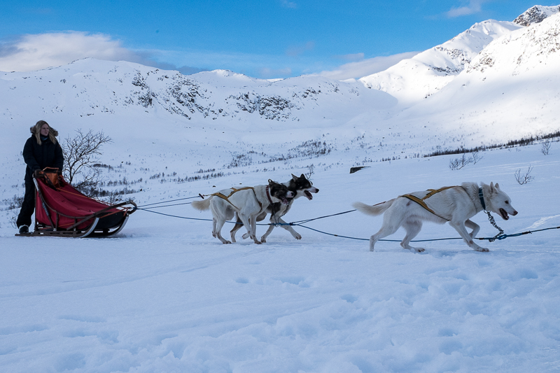 Übersetzen könnte man den Namen unserer Insel Sommarøy mit Sommerinsel. Und bei 4 Grad Außentemperatur (nachts -2) scheint es für die Norweger auch so zu sein. Denn wir haben bereits die ersten mit kurzer Hose und T-Shirt gesichtet. Das Personal hier im Hotel empfindet die Temperaturen auch als frühlingshaft und sie vermissen etwas den Schnee. Nun ja, hier direkt auf der Insel liegen so 10 bis 20 cm, meist in Form von blankem Eis. Aber nur wenige Kilometer Richtung Festland sind es dann schon zwischen 1 und 3 Metern. Dort haben wir uns dann auch in der „Schneefotografie“ versucht. Es ist gar nicht so einfach in der weißen Landschaft geeignete Strukturen zu finden und den Schnee nicht dunkelblau erschienen zu lassen. Aber die endlosen weißen Flächen sind schon faszinierend, besonders, wenn man dann noch zwei Hundeschlitten entdeckt.
