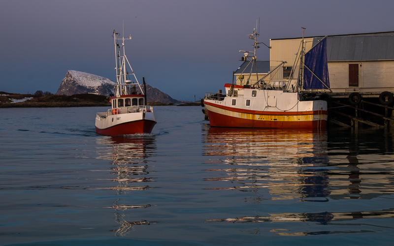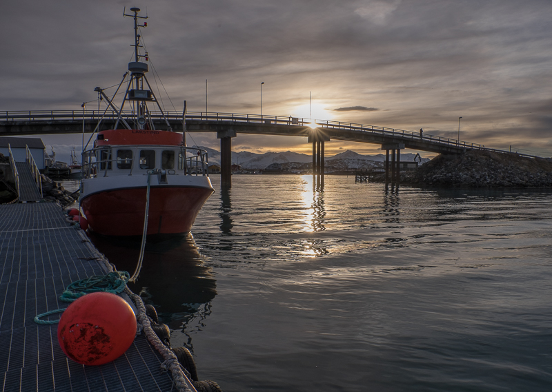 Selbst in diesem von Fischindustrie geprägtem Ort werden wir jeden Tag vom Zauber des Lichts des Nordens gefangen. Endlose blaue Stunde, lange Schatten und eine Sonne die immer mal wieder zwischen dunklen Wolken hervorkommt… hier könnte man ewig fotografieren. Da wartet man, dass die Sonne hinter dem Berg verschwindet, aber sie bewegt sich nicht nach unten sondern überwiegend quer. Da kann das Warten schon einmal eine kalte Angelegenheit werden.
