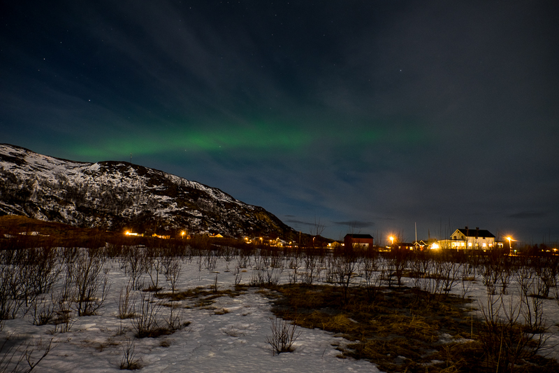 Tja, mit dem Polarlicht (Aurora borealis) sind wir leider nicht besonders gesegnet. Die Aktivität ist niedrig und der Himmel des nachts meistens bedeckt. Aber manchmal kann man dann doch etwas „grün“ in den Wolkenlücken des nächtlichen Himmels erblicken. Und sofort beginnt natürlich die fotografische Hektik… Anziehen, noch mehr anziehen, Handschuh suchen… (Handschuhe verlieren sich leicht, wir haben inzwischen eine stattliche Anzahl von Einzelstücken aufzubieten), Stativ schnappen und ab nach draußen und… RUMMMS liegt man wahlweise auf der Nase oder dem Rücken, weil man in der Hektik die Spikes vergessen hat. Schnell ein paar Meter vom Hotel weg ins Dunkel und das Stativ aufgestellt, Kamera drauf… und… schon ist das Licht wieder weg.