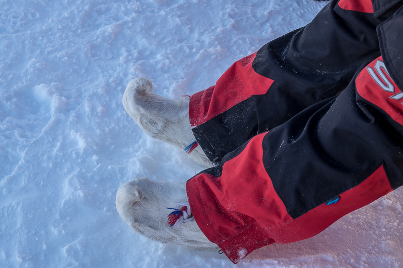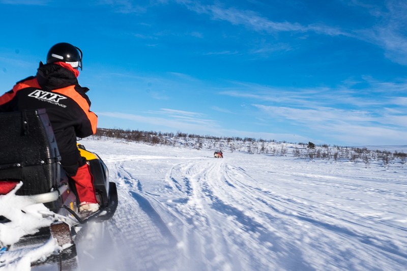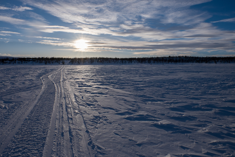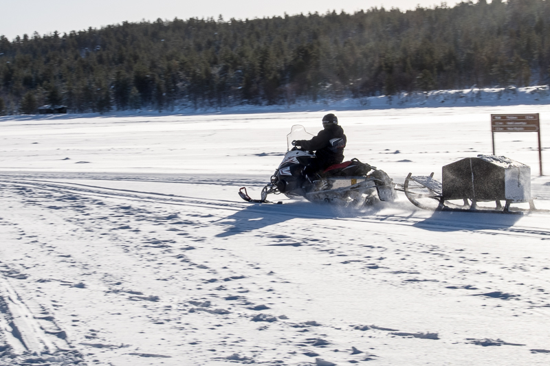 Gestern wurden wir ganz klassisch mit einem Motorskooter in einem angehängten Schlitten durch die Wildnis gezogen. Es ist schon ziemlich einsam und trotzdem sieht am immer mal wieder ein Haus oder… noch häufiger… einen anderen Schneescooter. Für diese Motorfahrzeuge gibt es hier zahlreiche Autobahnen in der Wildnis, allerdings muss man wissen wo man ist und wo man hin will, denn Schilder gibt es nicht.