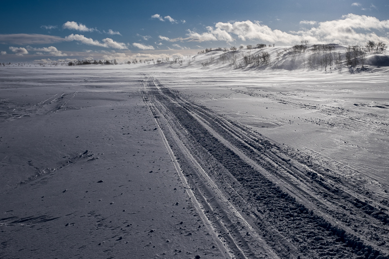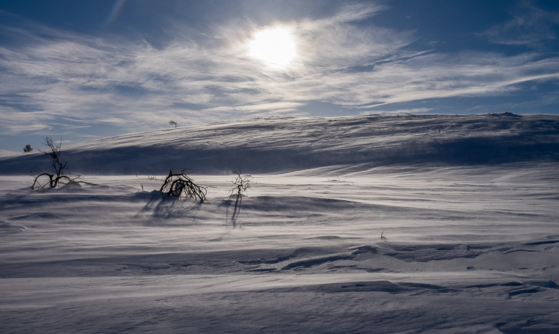 Landschaftlich ist es ganz anders als die bisher in Norwegen erlebte, flache Tundra mit unzähligen Seen und Sümpfen, allerdings alles bedeckt mit 1 bis 2 Meter Schnee. Tagsüber liegen die Temperaturen bei knapp unter null, aber nachts kann es schon mal bis auf minus 10 Grad abkühlen. Die Schneeoberfläche ist größtenteils etwas gefroren, was einem die Illusion erlaubt man könne darauf gehen. Aber nach einigen Schritten versinkt man dann urplötzlich gern mal bis zur Hüfte im Schnee. Da hilft dann nur auf allen vieren weiter krabbeln, bis man wieder etwas festeren Grund findet.