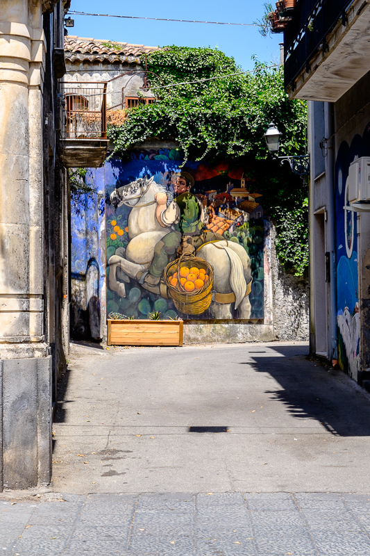 Dadurch verschiebt sich unser Zeitplan und der absolut notwendige Mittagsespresso wird in Linguaglossa eingenommen. Auch diesen Ort haben wir schon sehr oft durchfahren und nie gestoppt. Nun entpuppt sich dieser auf den ersten Blick so düster und unscheinbar wirkende Ort doch als wahres Kleinod. Es gibt viele, teilweise schon etwas verwitterte Wandmalereien. Wahrscheinlich ein Überbleibsel aus einer Aktion „Unser Dorf soll schöner werden.“