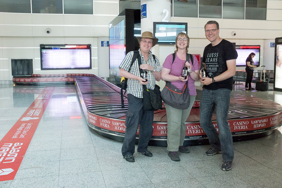 Tbilisi empfängt uns mit Sonne und „angenehmen“ 35 Grad. Die Einreiseformalitäten sind eine wahre Freude. Es gibt ausreichend Personal, also keine Warteschlange, wir werden freundlich begrüßt, erhalten unseren Stempel in den Pass, man wünscht uns einen angenehmen Urlaub und schenkt uns einen halben Liter Saperavi Rotwein als kleine Einstimmung auf das Land. Das ist mir noch in keinem anderen Land passiert!!!