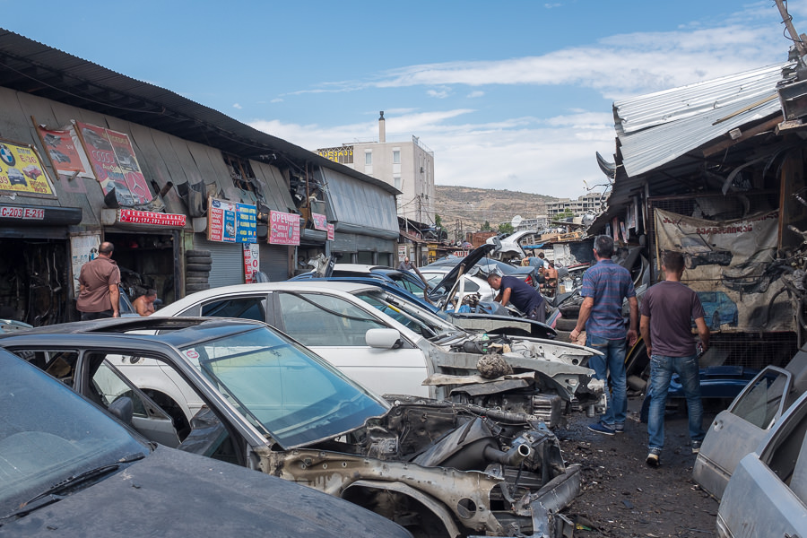 Auch den dritten Tag lassen wir ruhig angehen. Zunächst einmal muss ich ein Netzteil für mein MacBook besorgen, da meines merkwürdigerweise zu Hause liegt (muss sich nachts aus dem Koffer geschlichen haben). Im zweiten Geschäft werden wir fündig und wir können unser heutiges Ziel, den Eliava Markt ansteuern. Auf diesem aus mehr als 1500 Händlern bestehenden „Bau- und Automarkt“ war ich schon im letzten Jahr und daher musste ich noch ein paar Fotos verteilen. Das ist schon immer ein ziemliches Hallo. Motive gibt es hier genug und so wälzen wir uns durch schmale Gänge, an halben oder viertel Autos vorbei, steigen über Motorblöcke, Getriebeteile und Kopplung und sind dann irgendwann so erschöpft, dass wir dringend ein Pause benötigen.