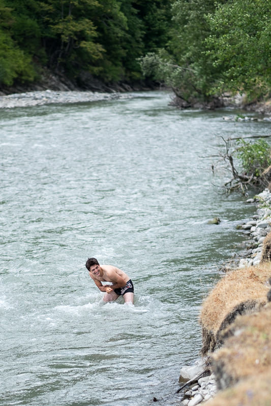 Und dann geht es Richtung Norden. Zunächst eine ganze Zeit an der Ostseite des Ananuri-Stausees entlang  und dann langsam das Tal hinauf. Direkt am Fluss machen unsere Picknickpause. Lasha nutzt die Gelegenheit für ein Bad.