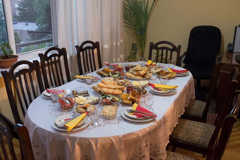 Wer einmal bei einer georgischen Familie eingeladen war, wird sich immer daran erinnern. „Der Gast kommt von Gott“ heißt es in Georgien und so fühlt man sich auch. Wir wurden herzlichst begrüßt und mit Übersetzungshilfe von Lasha und George klappte die Verständigung prima. Erst als das Essen in drei Lagen übereinander auf dem Tisch stand, war es nach Ansicht der Gastgeber gerade eben ausreichend. Nach georgischer Tradition begann Lasha’s Vater als Tamada (Tischherr) mit dem ersten Trinkspruch. Normalerweise wird das Glas Wein dann in einem Zug ausgetrunken. Wir haben allerdings versucht ein wenig zu „schummeln“ damit wir den Abend überhaupt überleben. Und es wurde uns großzügig nach gesehen.