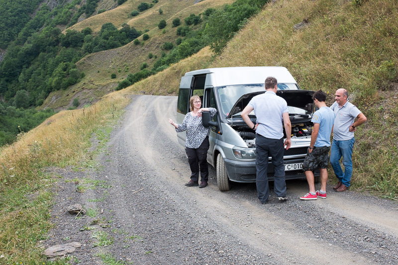 Die „Bergaufpassagen“ schafft unser Transit allerdings immer schlechter und bei Gudani ist dann plötzlich Schluss. Die Ursache ist von Konstantin und Lasha schnell gefunden. Der Motor ist zu heiß, er wird nicht ausreichend gekühlt. Offenbar läuft der Ventilator nicht. Es wird Wasser nachgefüllt, diverse Sicherungen umgesteckt, aber der Ventilator kommt nicht mehr ans Laufen.