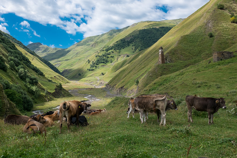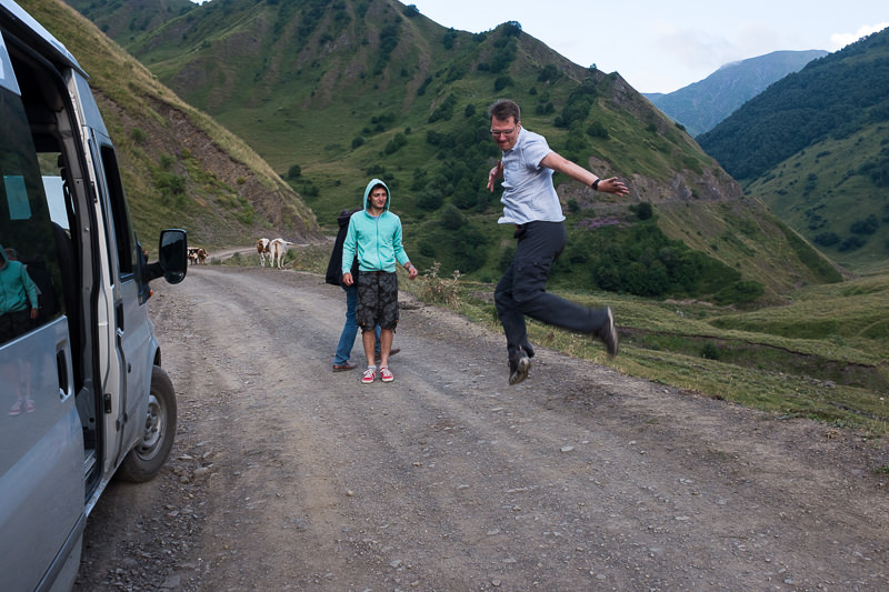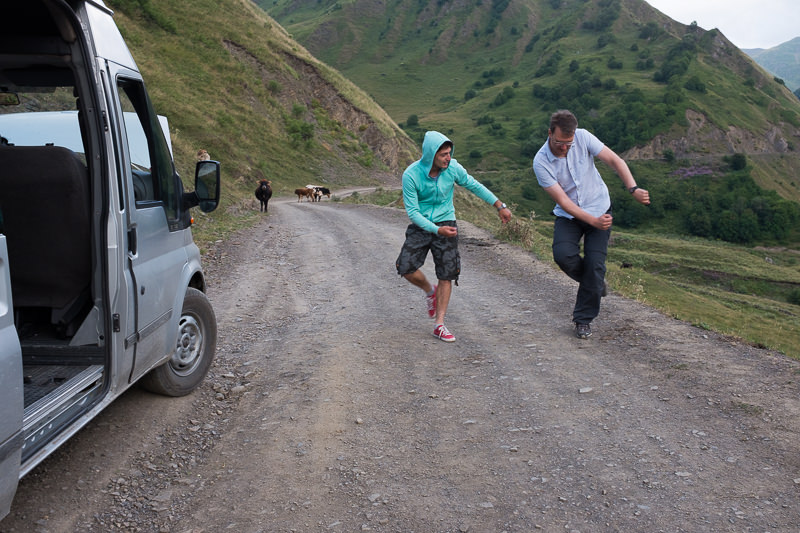 Wie vertreibt man sich zwei Stunden mitten in der Wildnis? Man fotografiert das Tal in verschiedenen Lichtsituationen, beschäftigt sich mit den vorbeiziehenden Kühen und Daniel versucht von Lasha georgischen Tanz zu erlernen.