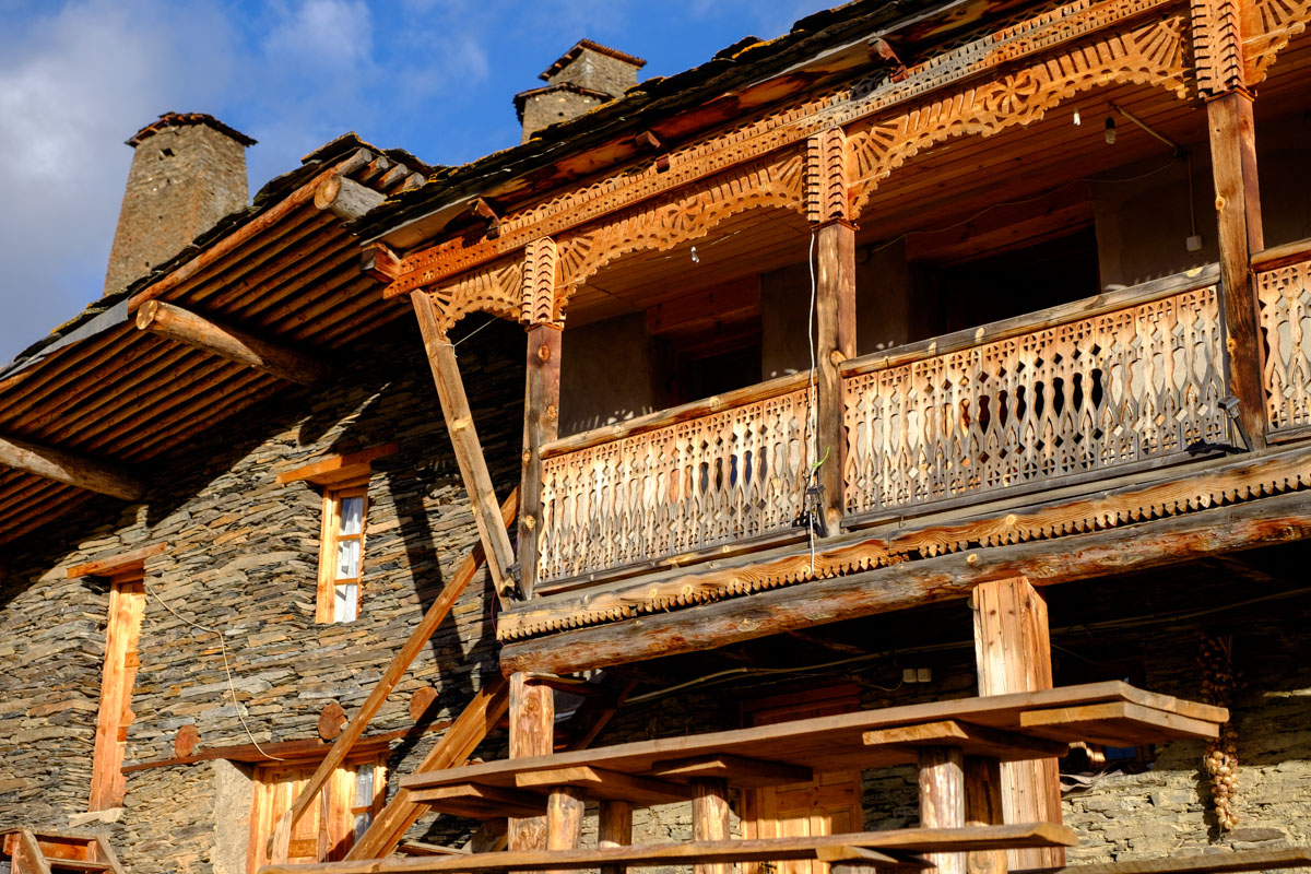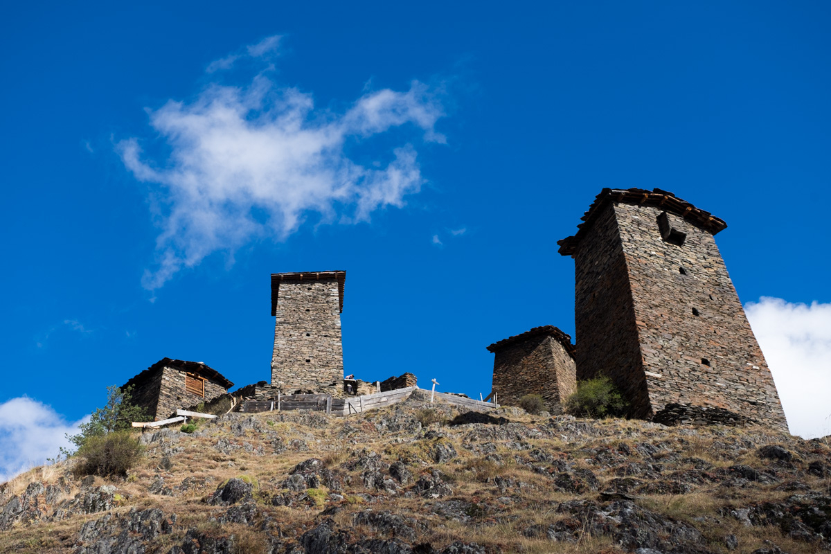 Wir sind 9 deutsche Touristen, ein Guide und drei Fahrer, also 13 Leute! Damit hat sich die Einwohnerzahl von Dartlo locker verdoppelt. Unser Quartier wußte zudem auch nichts von unserer Ankunft und hat auch irgendwie kein Platz. Aber wir sind ja in Georgien und da wird nicht gejammert, sondern Lösungen gesucht. Und nach einigen Diskussionen und einigem Hin und Her und Wenn und Aber… sind wir alle untergebracht. Zwar gab es für zwei nur ein Doppelzimmer statt zwei Einzelzimmer, aber immerhin Betten und ein Dach über dem Kopf. Diesmal ist unser Quartier etwas einfacher, es gibt Strom, aber die Wände aus gestapelten Steine geben an manchen Stellen den Blick nach draußen frei. Die Toiletten sind im Untergeschoss, während Elke und ich im OG wohnen. Also nachts zwei Stockwerke nach unten, das wird spannend. Ach ja, die Mobildeckung ist auch vorbei.
