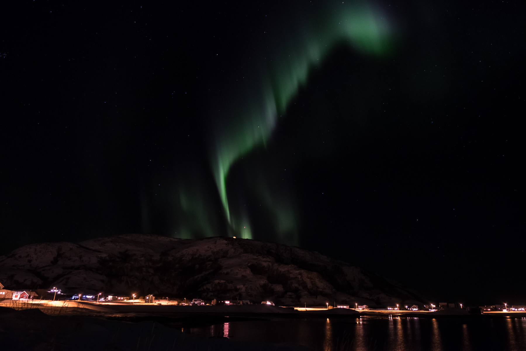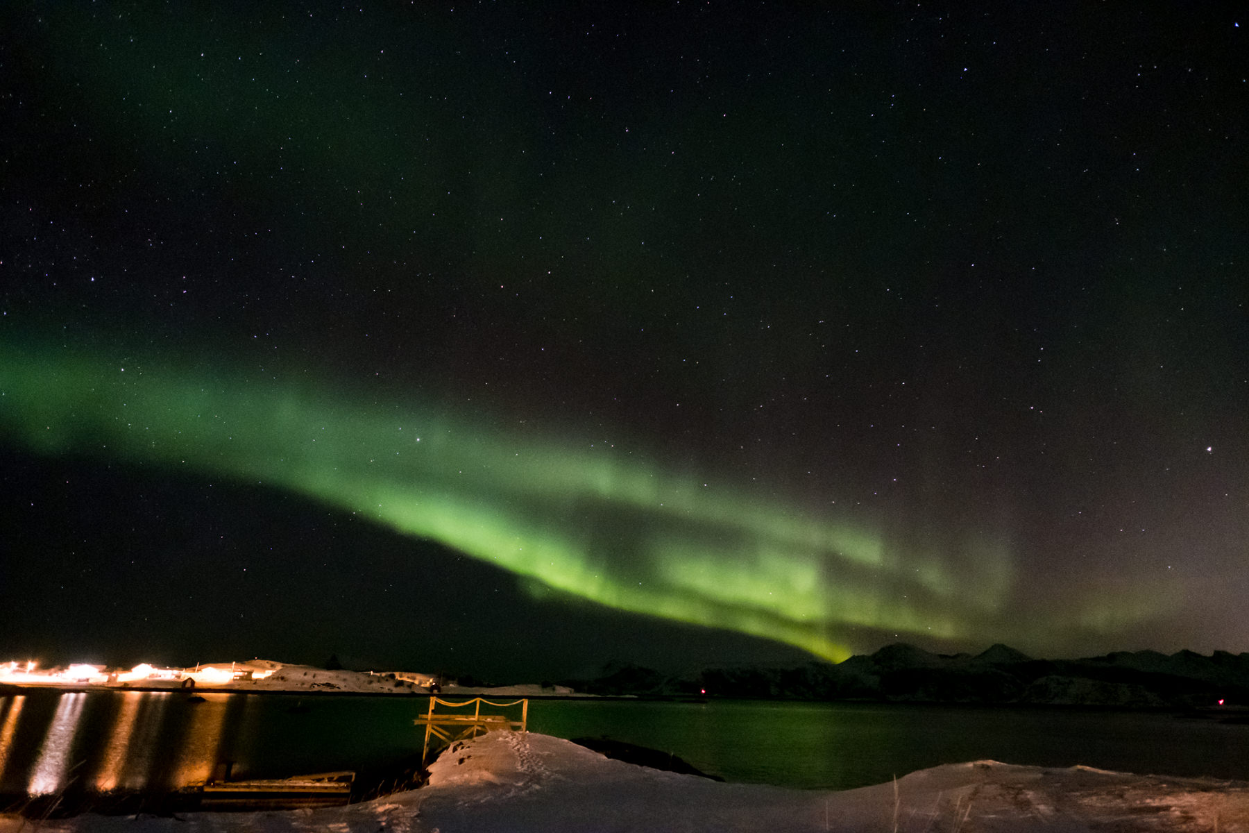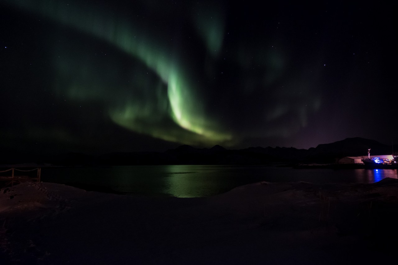 Na ja und Nordlicht müssen wir natürlich auch probieren. Nach dem Abendessen (natürlich Fisch) geht es vor die Tür. In hundert Metern vom Hotel auf einer kleinen Anhöhe im Fjord postieren wir uns (zusammen mit einigen wenigen anderen Fotografen) und schon geht es los. Trotz der Lichter der Straßenbeleuchtung ist das Nordlicht gut zu sehen und nach den üblichen Kämpfen mit Stativ und Kameraeinstellungen (wie geht unendlich, warum wackelt die Kamera auf dem Stativ, welche ISO nochmal, wo stellt man das ein, unendlich habe ich nicht, der fokussiert nicht, hat mal jemand Licht, die Zeit stimmt nicht, ich kann nur 1 sec, usw…) gelingen allen beeindruckende Bilder der „aurora borealis“, dem Nordlicht – das sich uns unablässig zeigt.