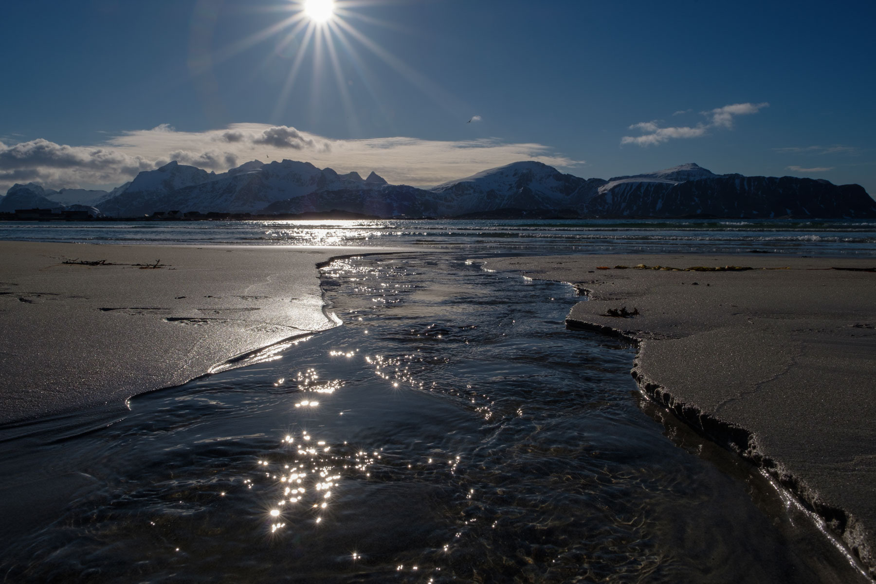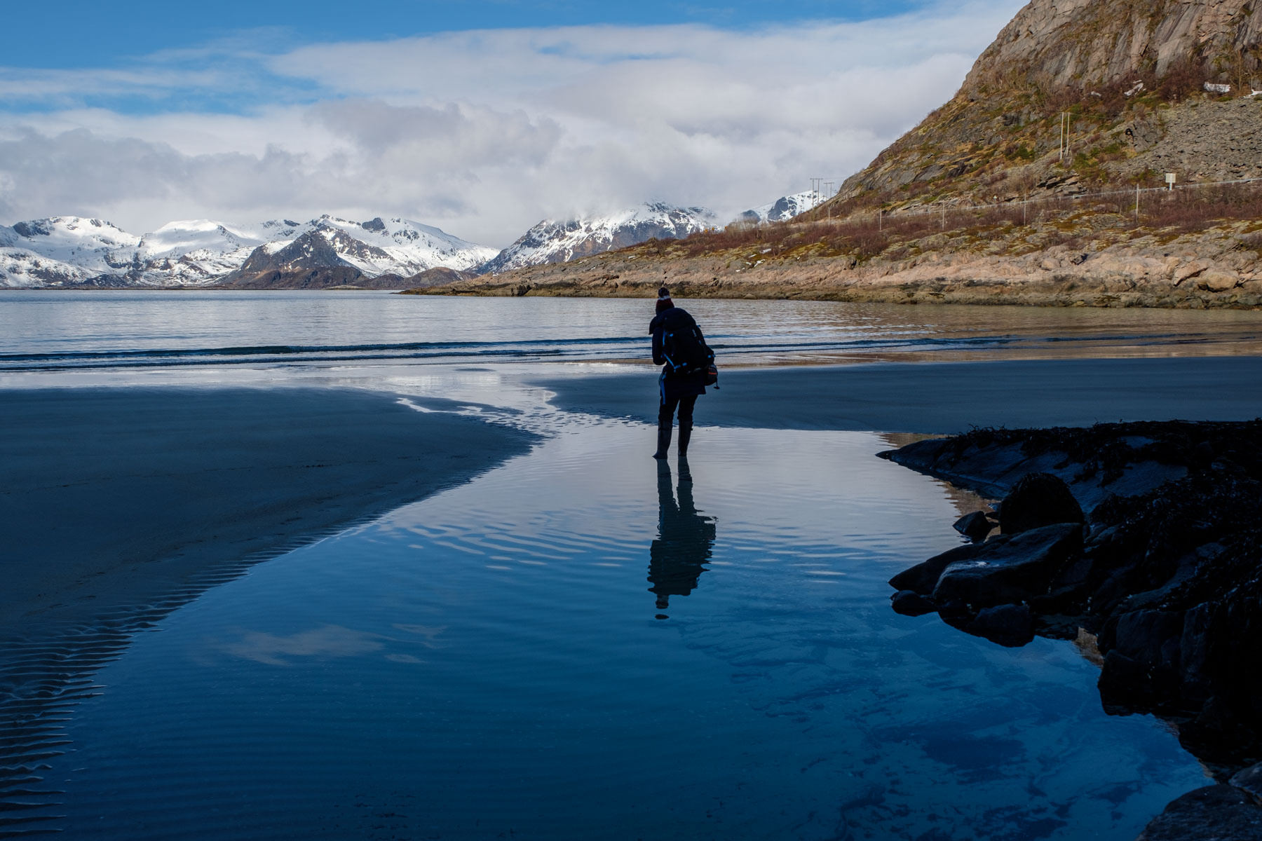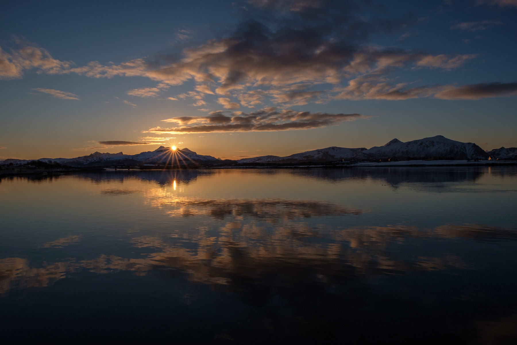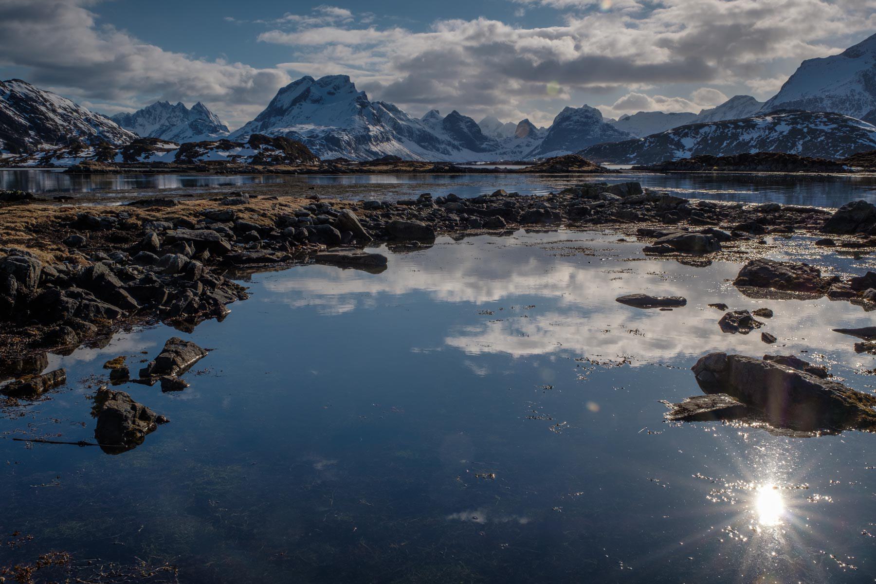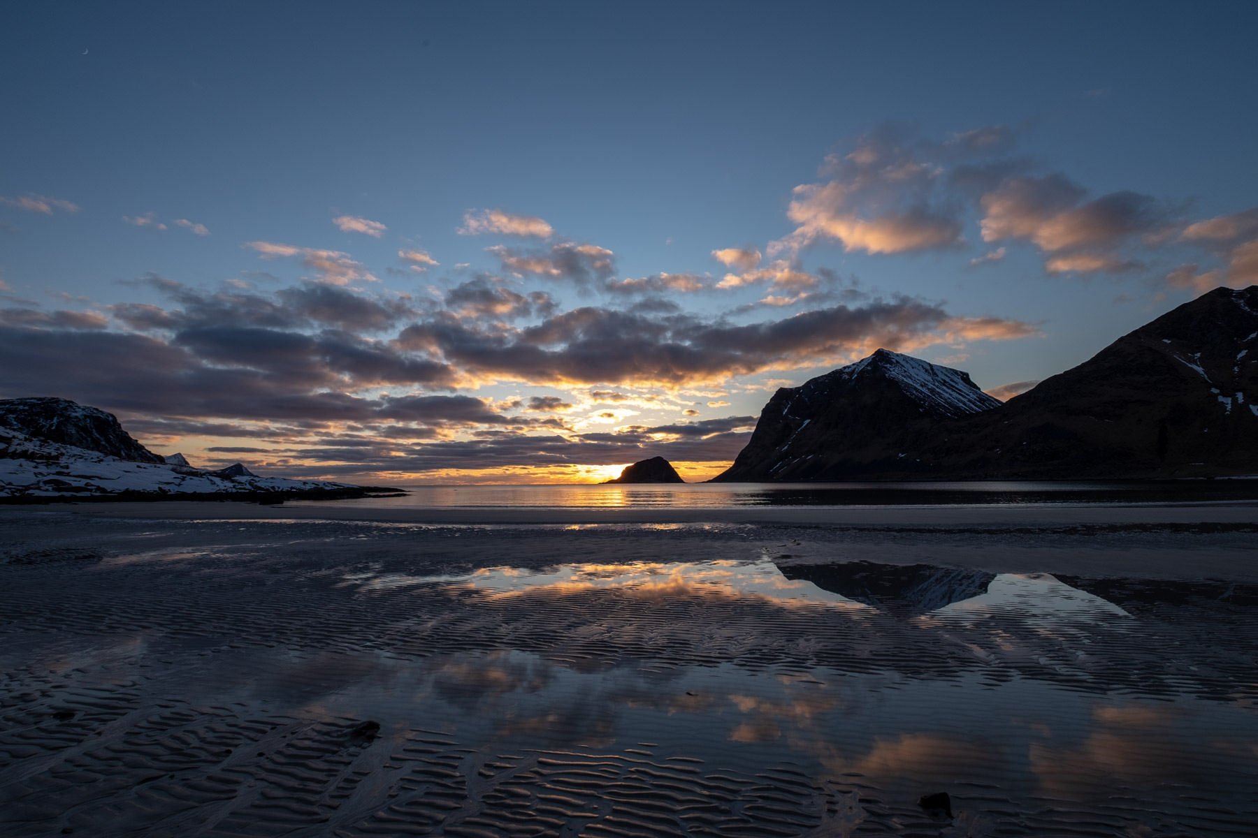 Nach einem ausgesprochen reichhaltigem Frühstück machen wir uns in Ruhe auf in Richtung Lofoten. Ein kleiner Abstecher nach Lødingen und dann weiter Richtung Südwesten. Die erste Bucht mit einer Spiegelung wurde natürlich sofort abgelichtet. Aber kurz vor Svolvær erlebten wir dann eine geradezu unwirkliche Spiegelung in einem großen Fjordarm, wie ich sie auf meinen zahlreichen Reisen auf den Lofoten auch noch nicht erlebt habe. Da war die Enttäuschung des wegen dichter Wolken ausgefallen Sonnennterganges am Abend am Haukland Beach leicht zu verschmerzen.