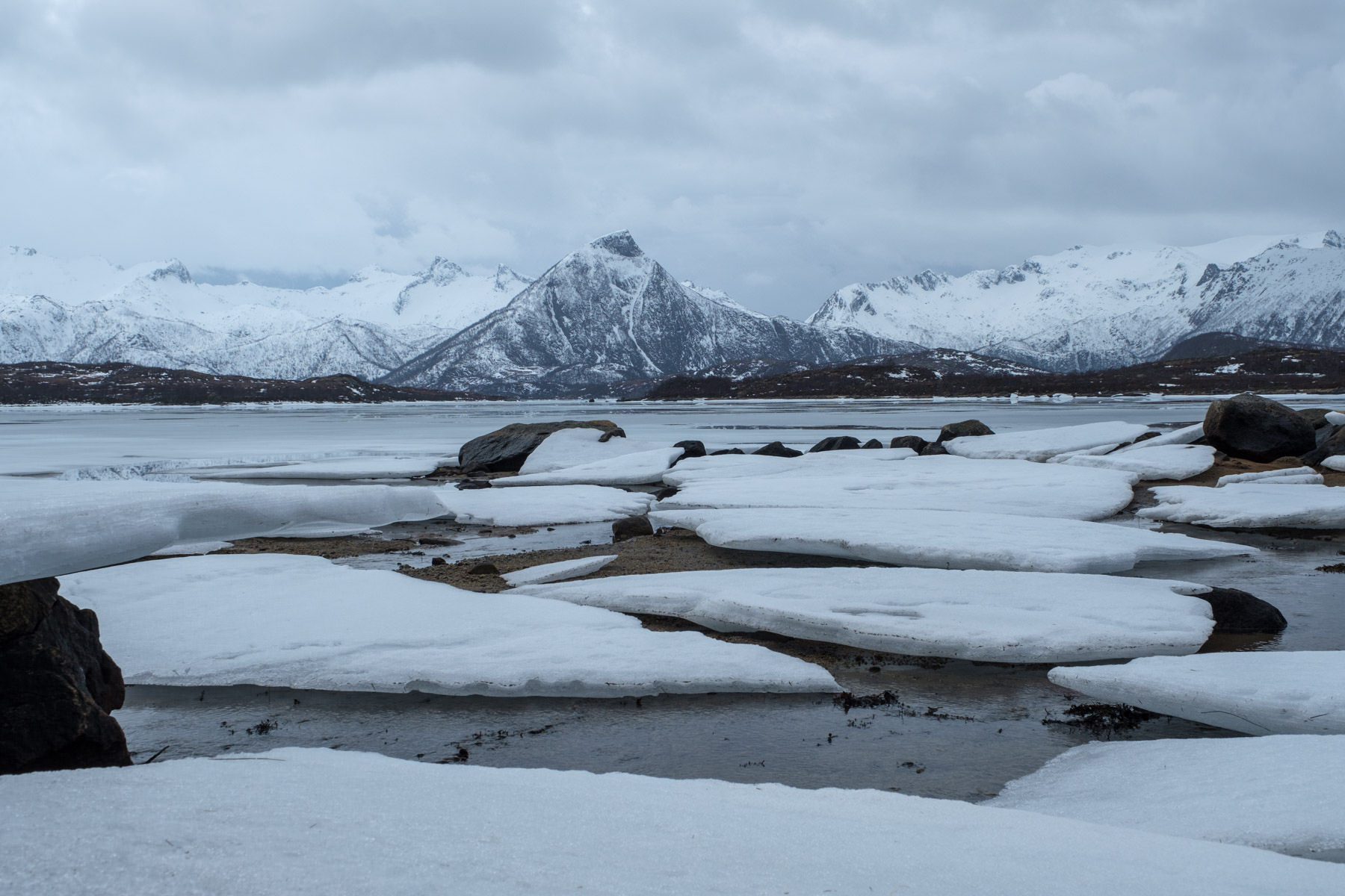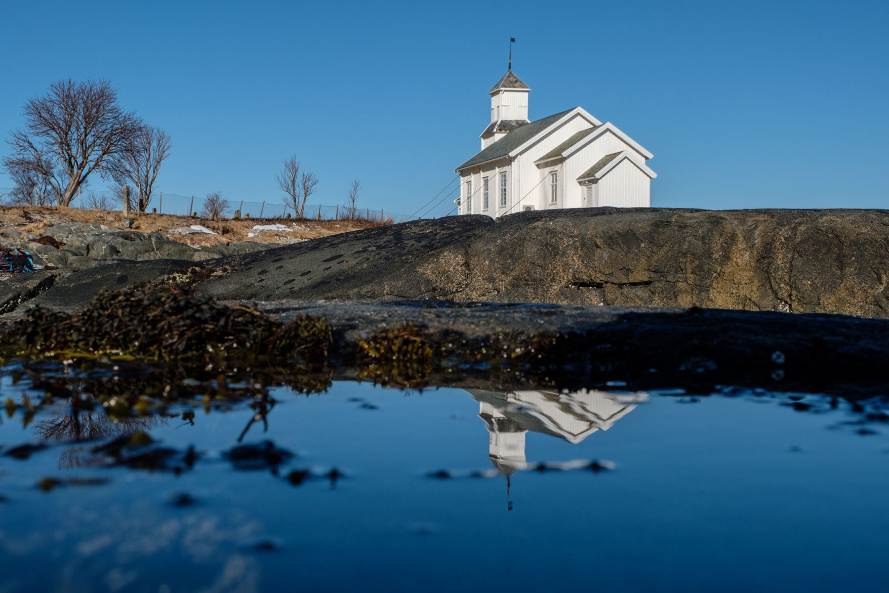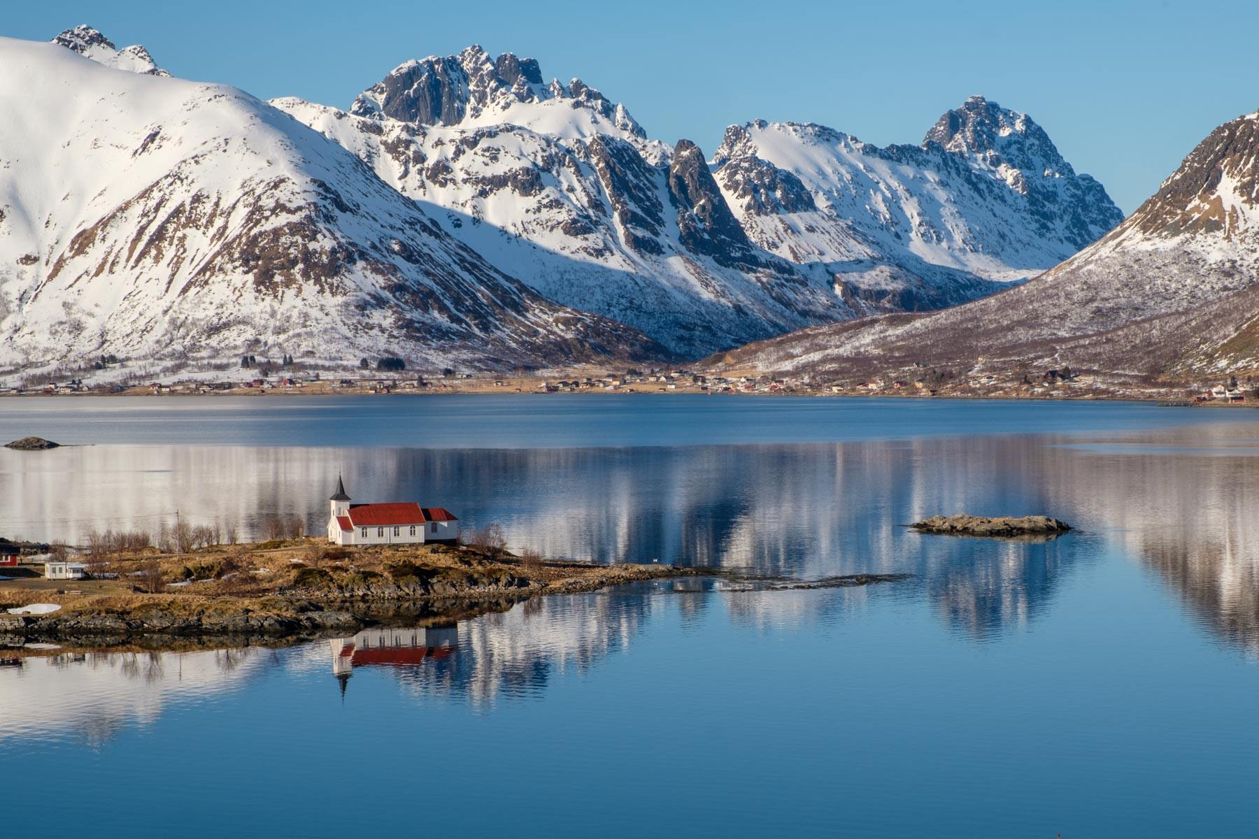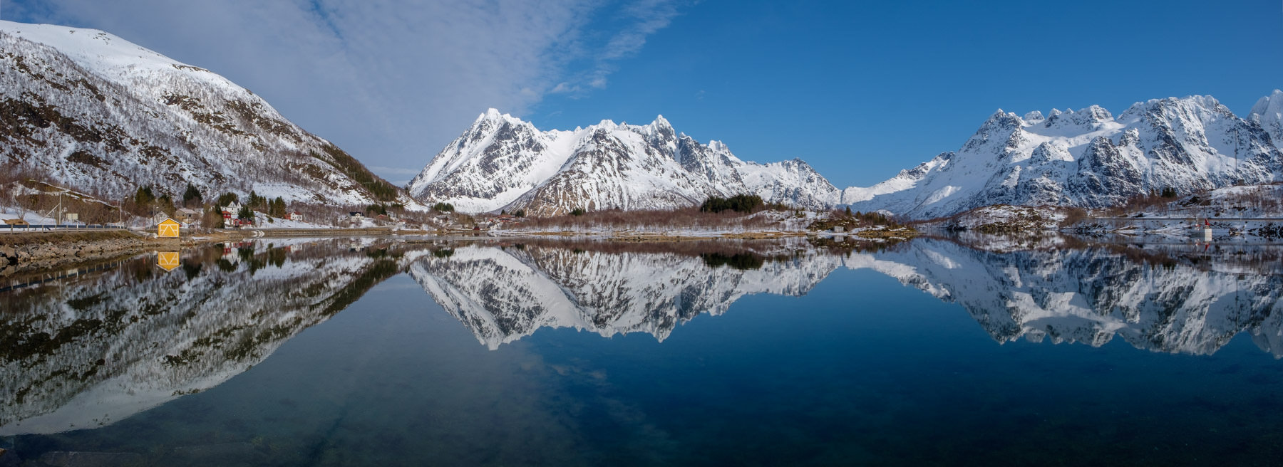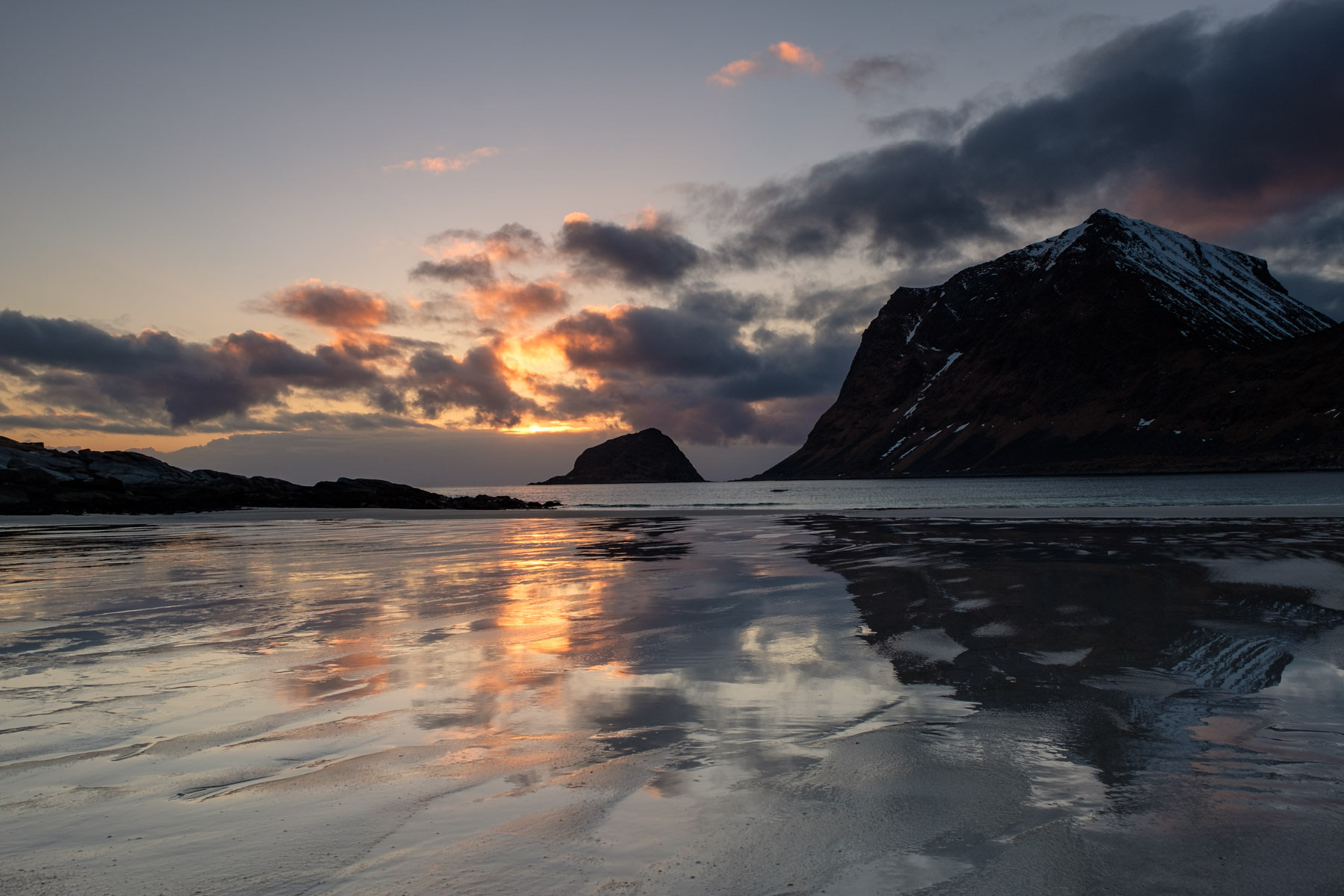 Nach einem ausgesprochen reichhaltigem Frühstück machen wir uns in Ruhe auf in Richtung Lofoten. Ein kleiner Abstecher nach Lødingen und dann weiter Richtung Südwesten. Die erste Bucht mit einer Spiegelung wurde natürlich sofort abgelichtet. Aber kurz vor Svolvær erlebten wir dann eine geradezu unwirkliche Spiegelung in einem großen Fjordarm, wie ich sie auf meinen zahlreichen Reisen auf den Lofoten auch noch nicht erlebt habe. Da war die Enttäuschung des wegen dichter Wolken ausgefallen Sonnennterganges am Abend am Haukland Beach leicht zu verschmerzen.