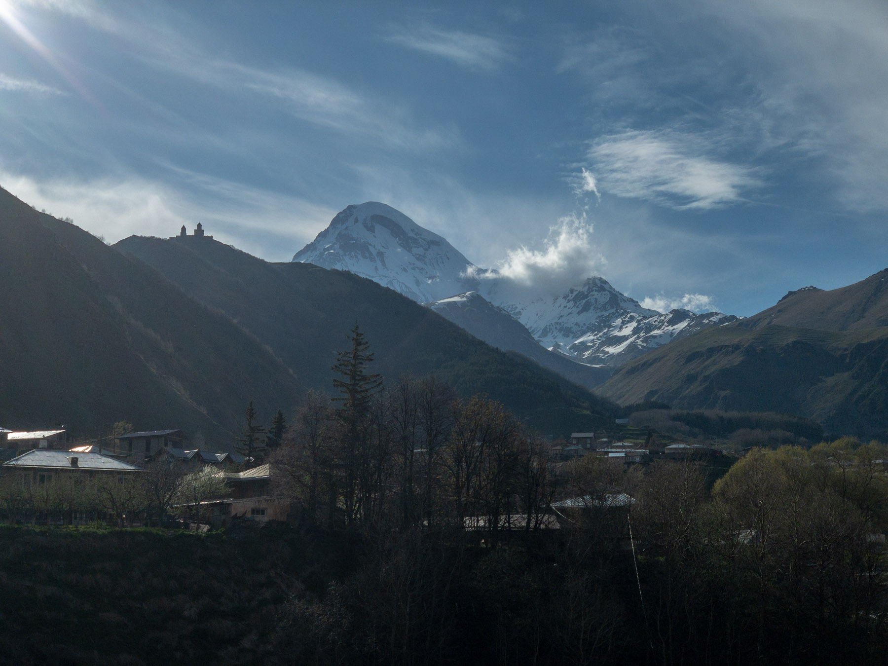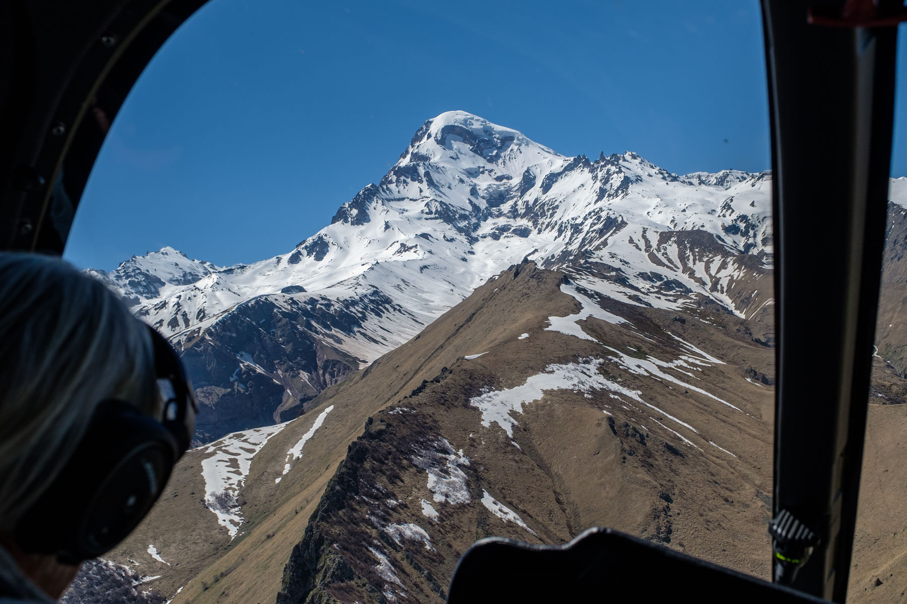 Am nächsten Morgen hieß es früh aufstehen. Den 5047m hohen Kasbek im ersten Sonnenlicht war die Aufgabe. Und wir wurden belohnt mit einem grandiosen Lichtspiel. Nach dem Frühstück ging es dann hinauf zur Kirche um diese in direkten Augenschein zu nehmen. Bei der folgenden Kaffeepause im Rooms-Hotel entdeckten wir einen Helikopter, der für Rundflüge zur Verfügung stand. Da ließen es sich einige nicht nehmen den großen Kaukasus auch noch von oben zu betrachten. Ein wirklich tolles Erlebnis, obwohl uns dadurch etwas Zeit für die Erforschung des Tales bis zur russischen Grenze verloren ging.