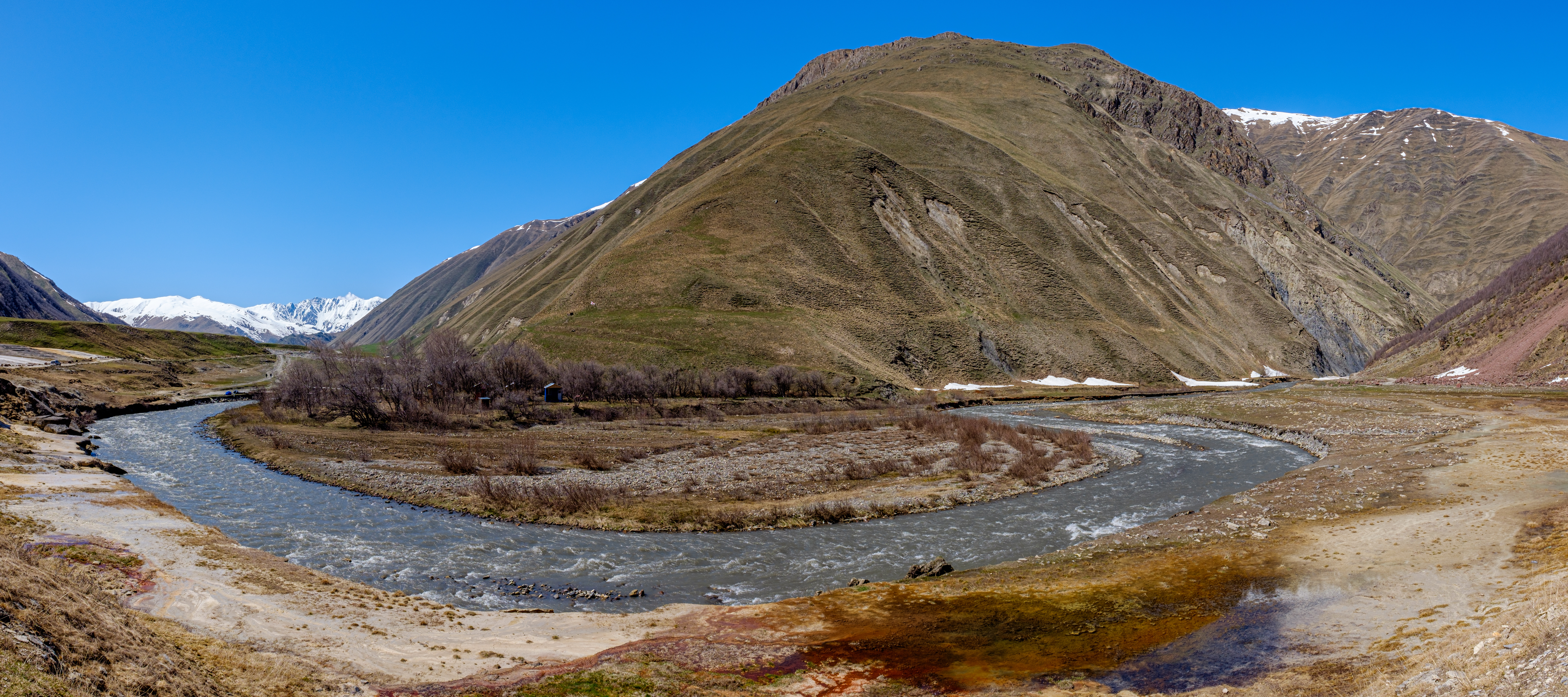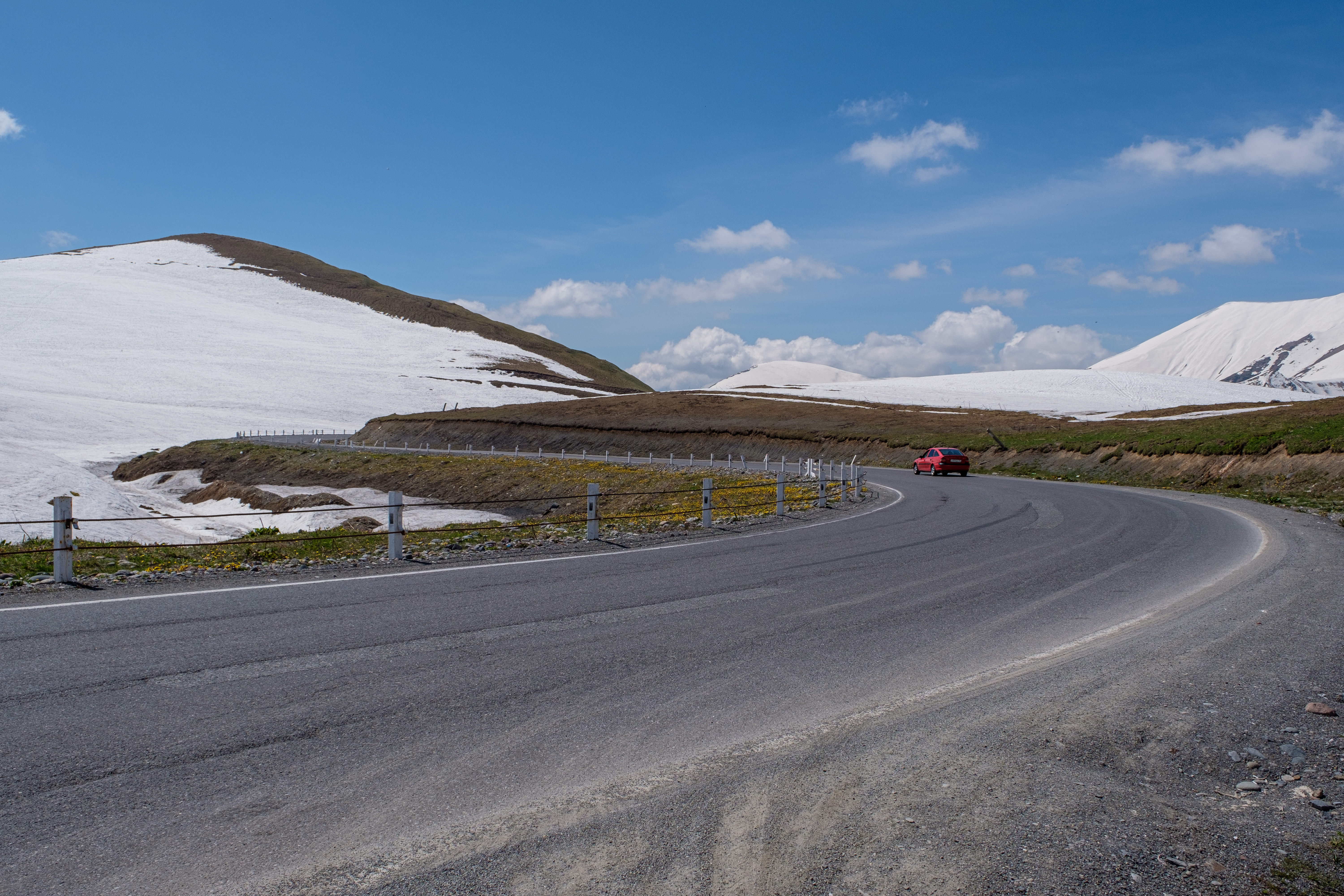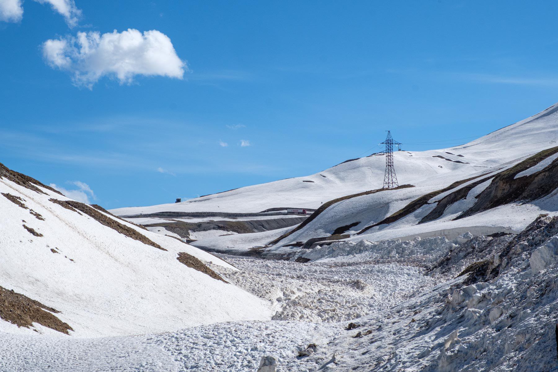 Der zweite längere Ausflug führt uns in den großen Kaukasus nach Stepantzminda. Natürlich auch hier wieder mit jeder Menge Fotostopps. Eine gemischte Ziegen / Schafsherde, die Festung Ananuri natürlich, einem zweifarbigen Fluß, einem Platz mit alten Autos, dem „Elefantenklo“ – korrekt Gudauri-Panorama und viel Schnee auf dem Pass.