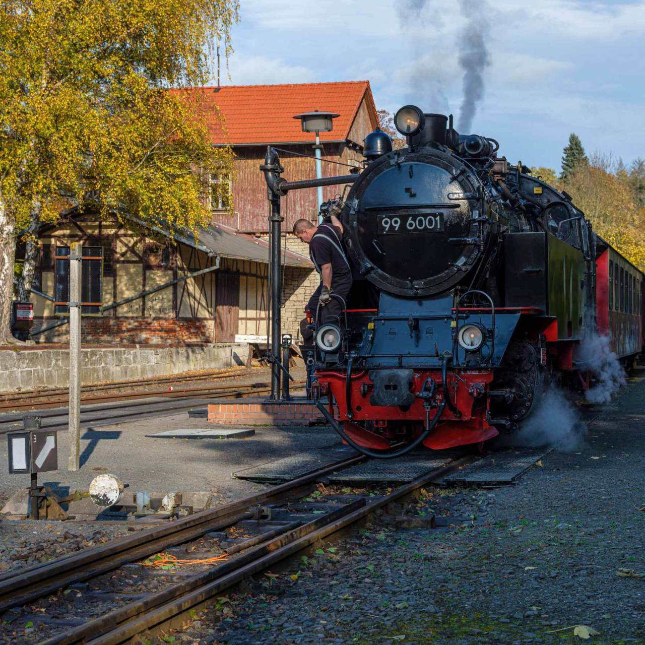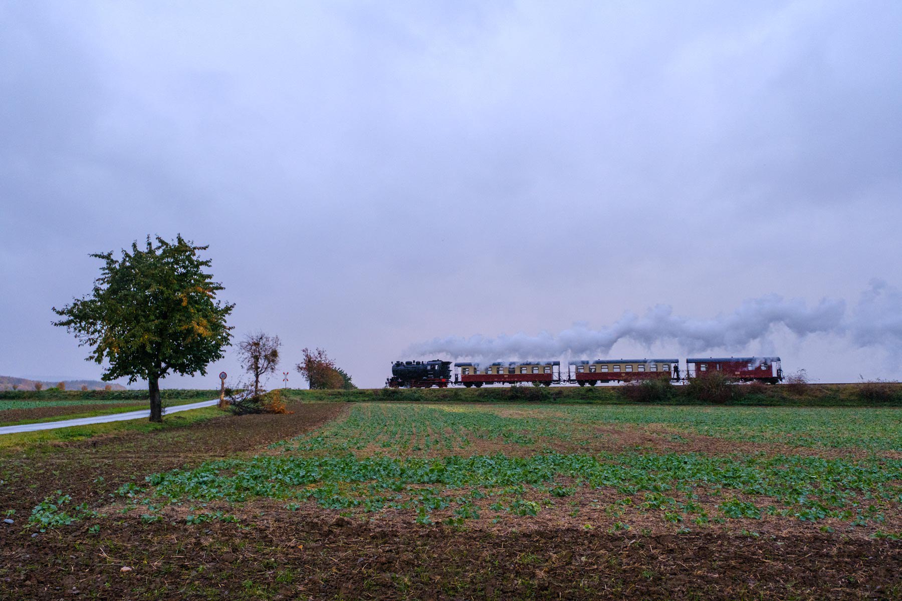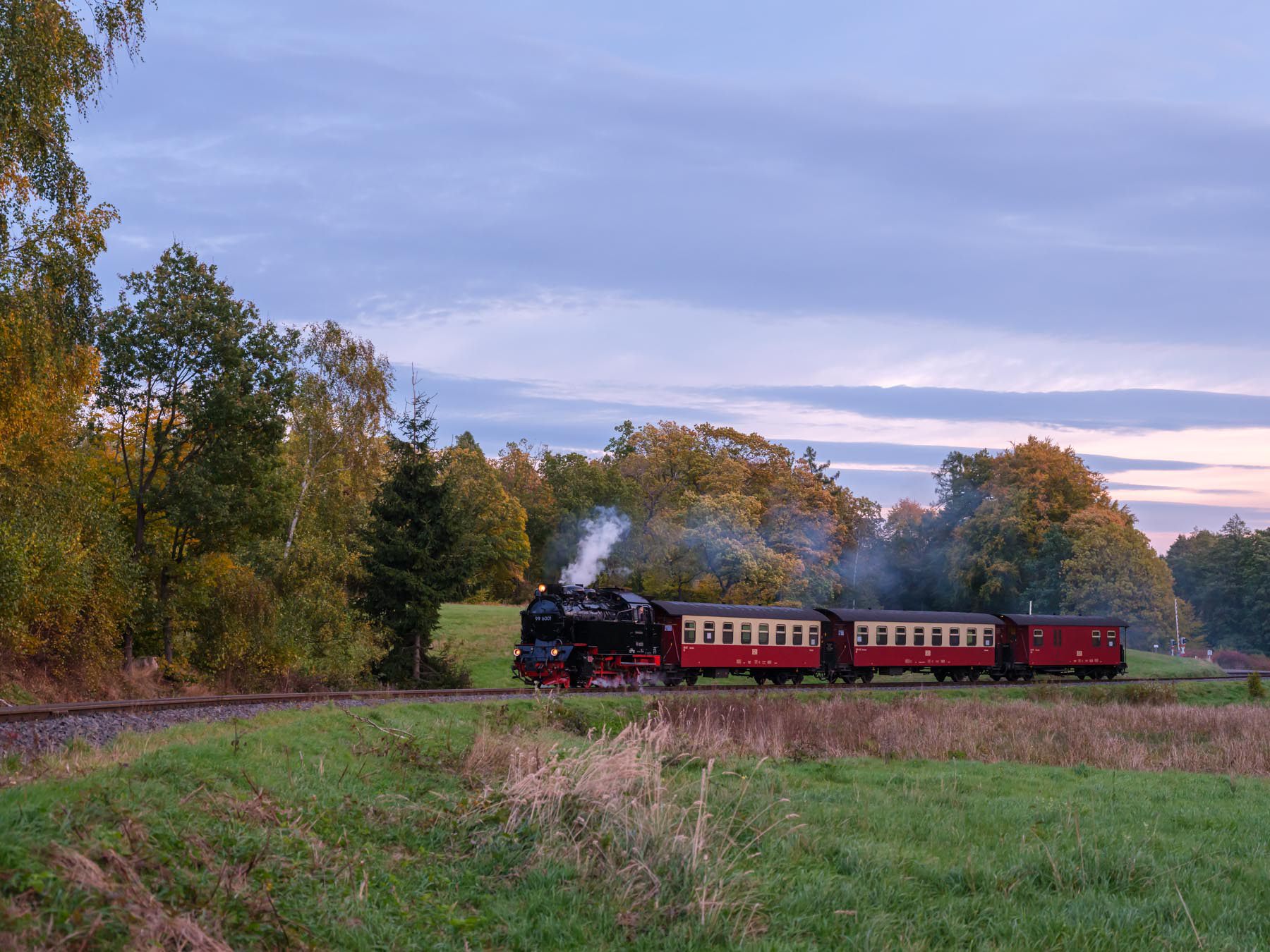 Für mich ging es trotzdem mehr um die Landschaft und die gelb-roten Waggons sollten doch wunderbar in die Herbstfärbung passen. Während Armin und Jürgen darauf achteten keine „modernen“ Dingen unpassend im Bild zu haben, die Dampflok nicht vor Masten oder Schildern zu platzieren, die Lok im richten Winkel zu erwischen und gelegentlich auch einmal das ein oder andere störende Gehölz beiseite zu schaffen, war ich hauptsächlich damit beschäftigt nicht im Wege zu stehen. Und so bekam ich am ersten Tag ein paar schöne Aufnahmen von der 99 6001 die den Beinamen „Ballerina“ trägt, weil sie auf den Schienen gern etwas „tänzelt“ wie mir später erklärt wurde.