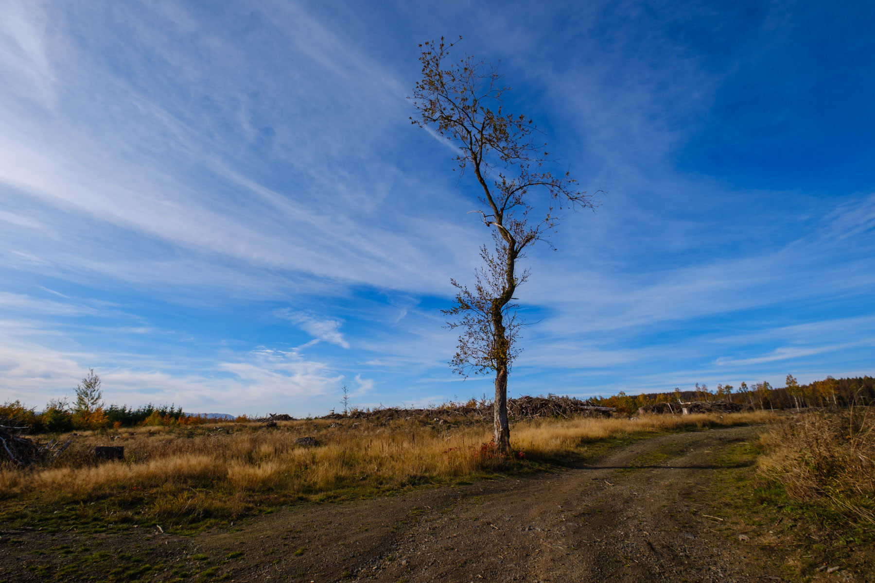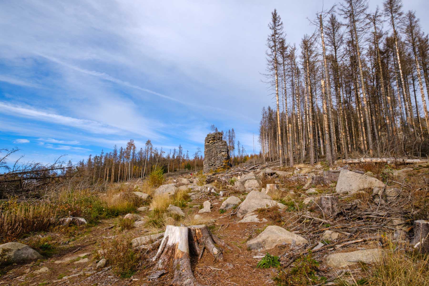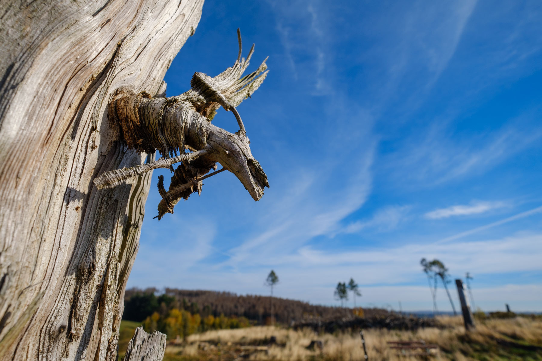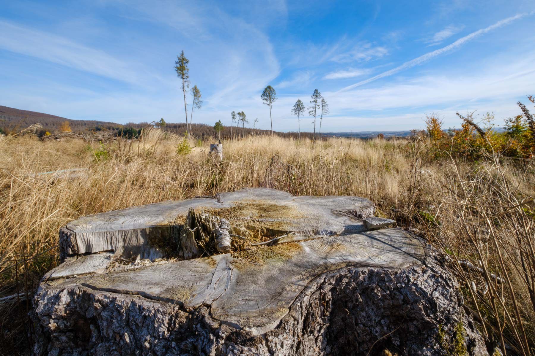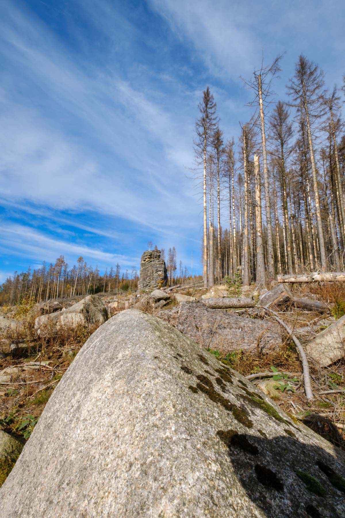 Unser Ziel waren aber die einst dicht bewaldeten Flächen bei Drei Annen Hohne. Der Borkenkäfer, Sturmschäden und Trockenheit haben den Fichtenwälder enorm zugesetzt und zur Vernichtungen riesiger Waldbestände geführt. Nun war der harz ursprünglich eigentlich ein Mischwaldgebiet, aber für den Bergbau wurde Fichte benötigt. Daher wurde große Monokulturen gepflanzt. Inzwischen die die großen Fichtenbestände aber komplett trocken und großflächig abgeholzt. Mühsam beginnt man nun damit diese Flächen wieder mit gesundem Mischwald zu bepflanzen. Aber die großen Kahlschlagflächen sind natürlich auch eine besondere fotografische Herausforderung.