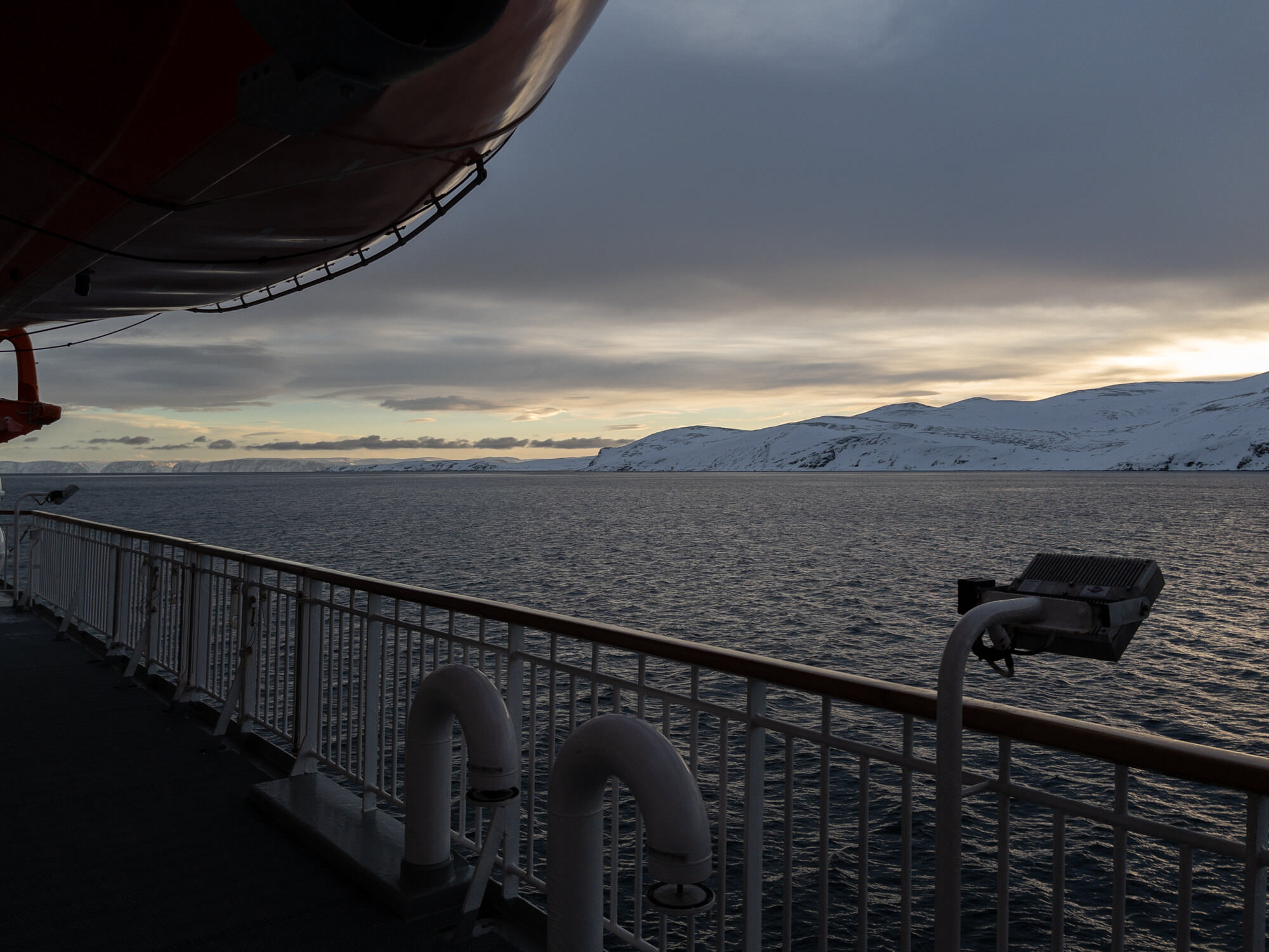 Nach einer etwas unruhigen Nacht, denn die An- und Ablegemanöver waren in einigen Kabinen doch sehr deutlich zu hören, war Havøysund der erste Stopp, den wir bei Licht miterleben konnten – genau passend zum Sonnenaufgang. Es ist einfach unbeschreiblich. Man kann das schöne Licht drinnen und draußen genießen. Da das Schiff nicht einmal halb voll war, gab es überall reichlich Platz.