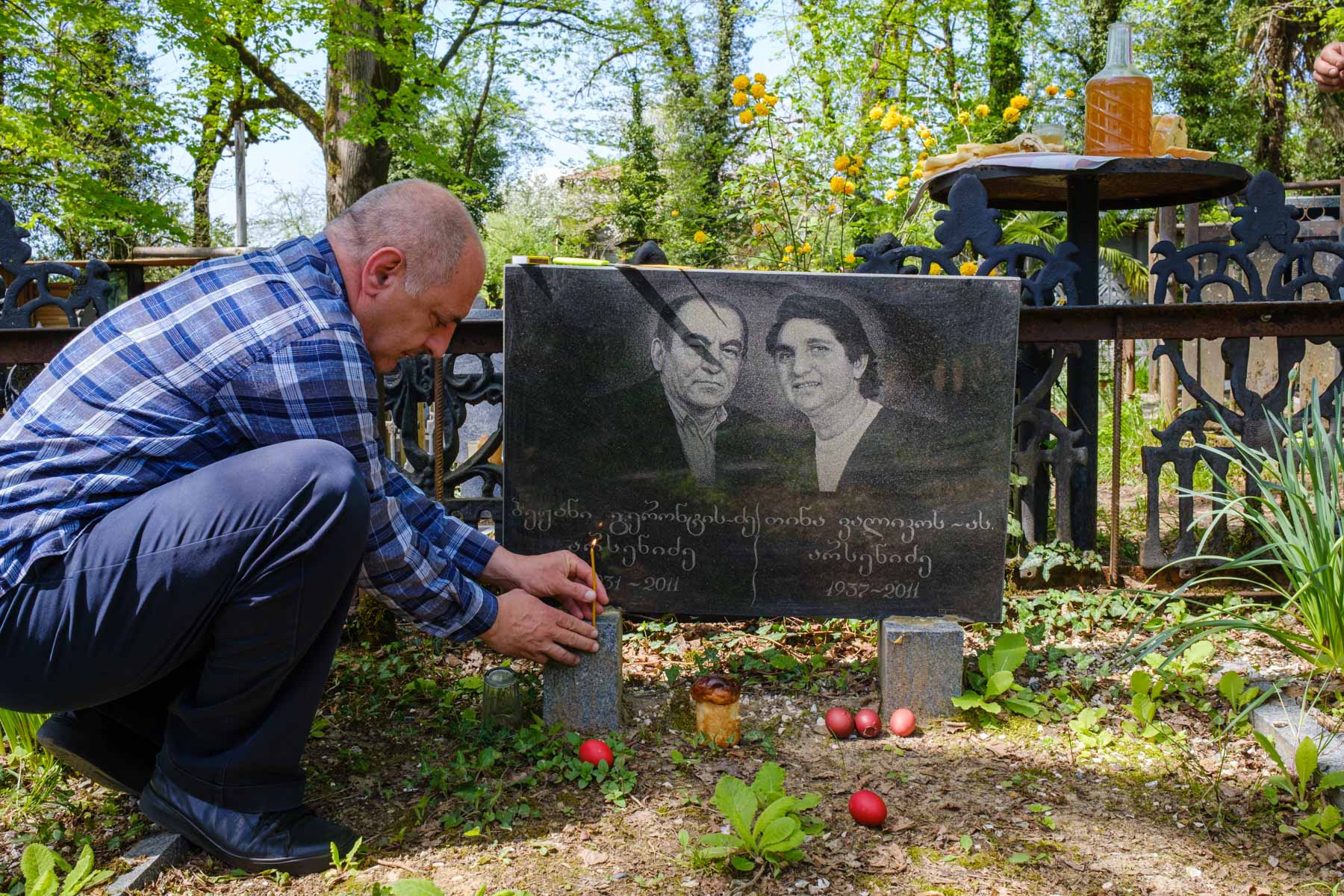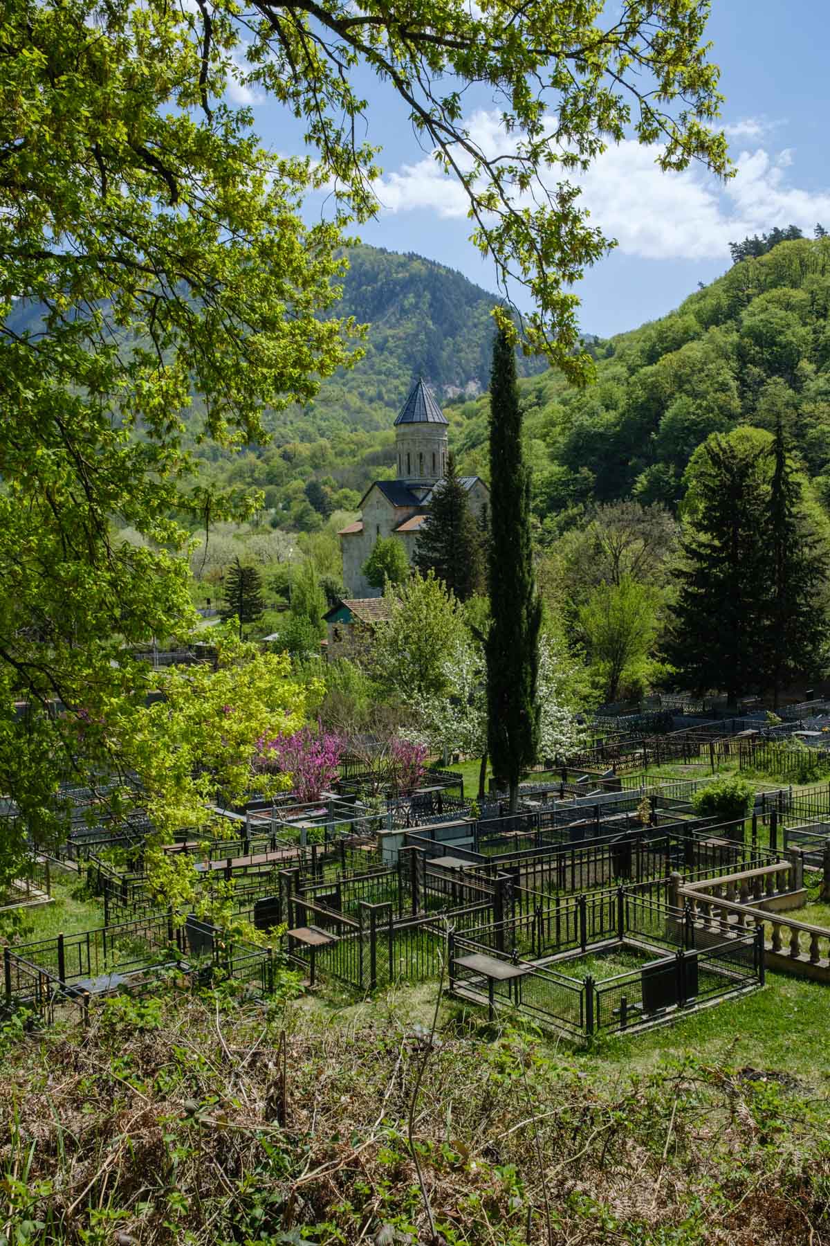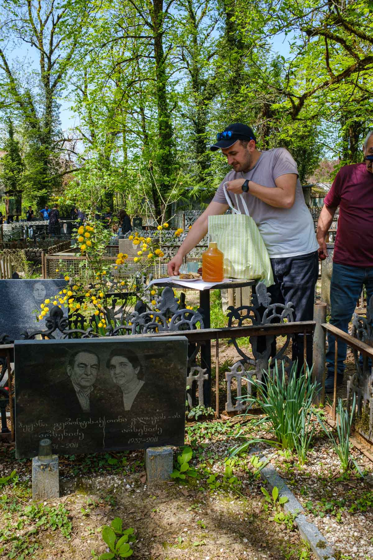 Zur Feier des Osterfestes fahren viele Georgier in das Dorf in dem sie aufgewachsen sind. Dort trifft man sich dann nicht etwa in der Kirche, sondern auf dem Friedhof um gemeinsam mit den Verstorbenen zu essen und zu feiern. Das hört sich zunächst etwas komisch an, aber an den Grabstellen gibt es eigentlich immer einen kleine Tisch und manchmal auch Bänke. Die Gräber wurden in den vergangen Tagen sauber gemacht und nun geht es mit Tischdecke, Essen und Trinken zum Grab. Und dort trifft man dann viele, die man vielleicht schon seit Monaten nicht gesehen hat. Man besucht sich gegenseitig an den Grabstellen trinkt auf das Wohl der Lebenden und Verstorbenen. Dabei gießt man mit dem Wein ein Kreuz auf die Grabstelle und trinkt den Rest aus. Da kann ein Gang über den Friedhof schon ganz schön „anstrengend“ werden. Die Lebensmittel bleiben übrigens größtenteils an der Grabstätte stehen – für die Verstorbenen. Aber abends dürfen sich die armen Leute dann gern auch dort versorgen.