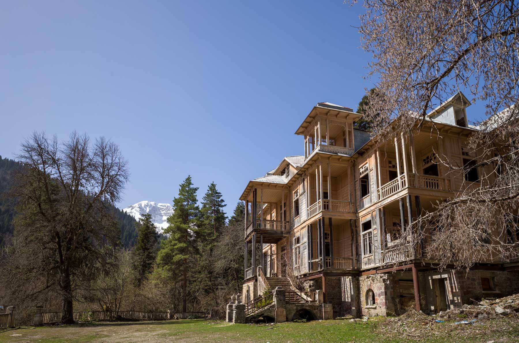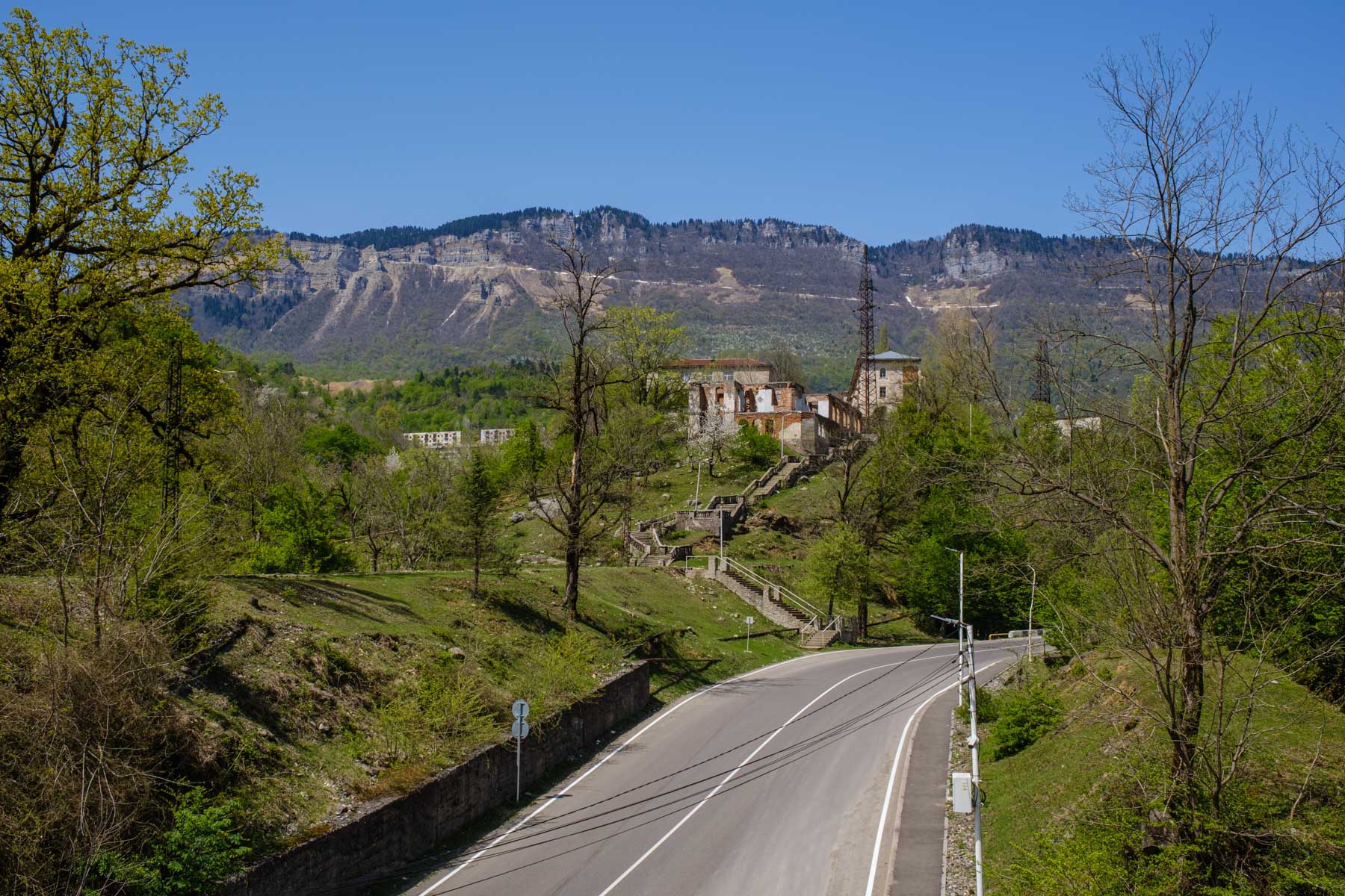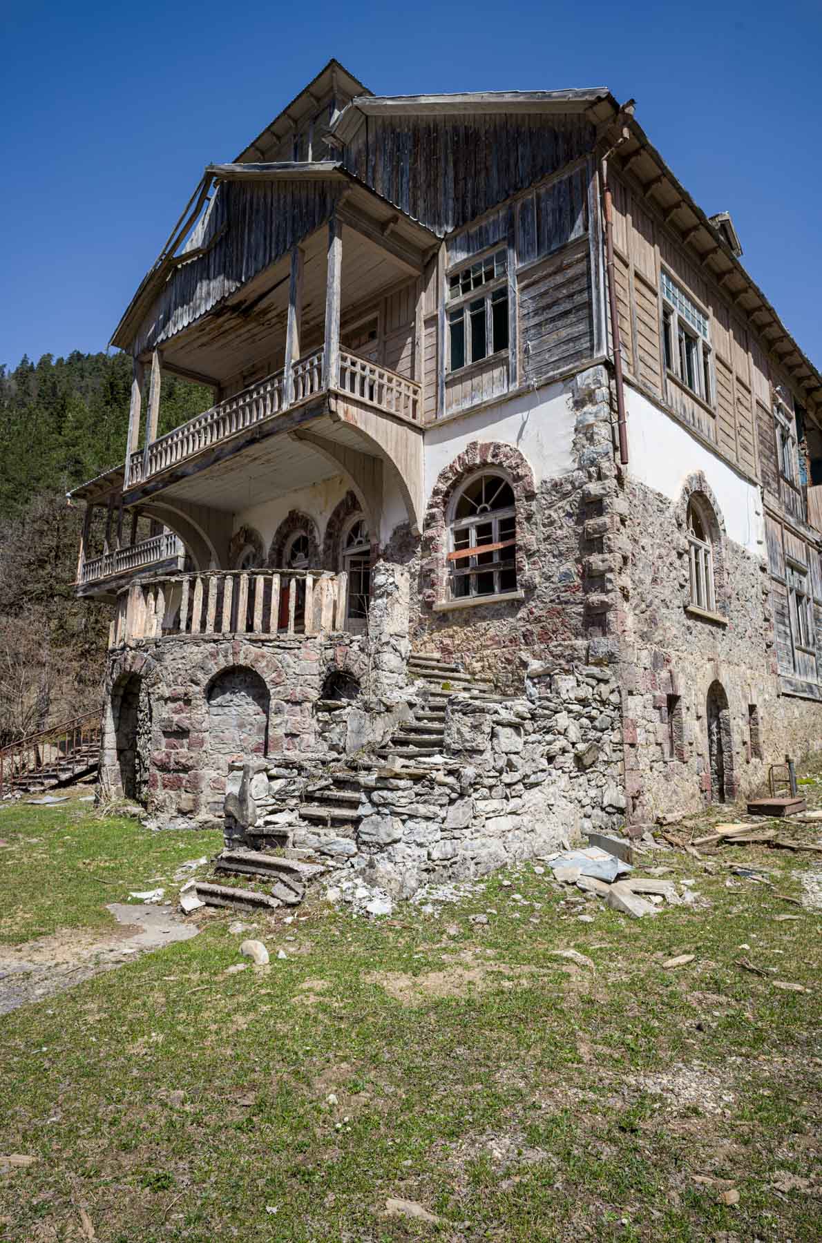 Der nächste Tag empfängt uns wiederum mit blauem Himmel und daher geht es zunächst zur Syngaoge. Dann fahren wir weiter bergauf nach Shovi. Früher ging die Straße hier weiter über den Pass, aber nach dem in 2008 der Teil Südossetien von Russland besetzt wurde ist hier eine geschlossen Grenze und die Straße nicht mehr befahrbar. Wir besuchen einen lost place „Stalins Datscha“. Warum das so heißt, weiß kein Mensch. Er war sicher nie hier und kannte es vermutlich nicht einmal. Direkt daneben liegt ein altes Feriendorf, also noch ein wenig lost place und dazu in grandioser Natur.